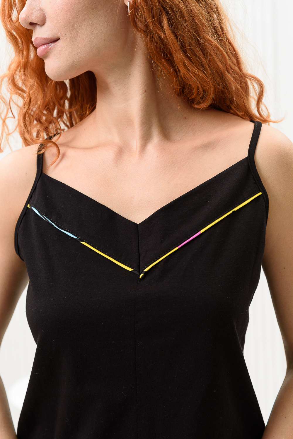 Комплект состоит из майки и шорт. Майка на тонких бретелях, с V-образной горловиной на полочке, с отделочным кантом по горловине и низу. Горловина и бретели обработаны бейкой из основного полотна. Шорты прямые, короткие, с манжетом и отделочным кантом, на резинке.