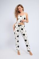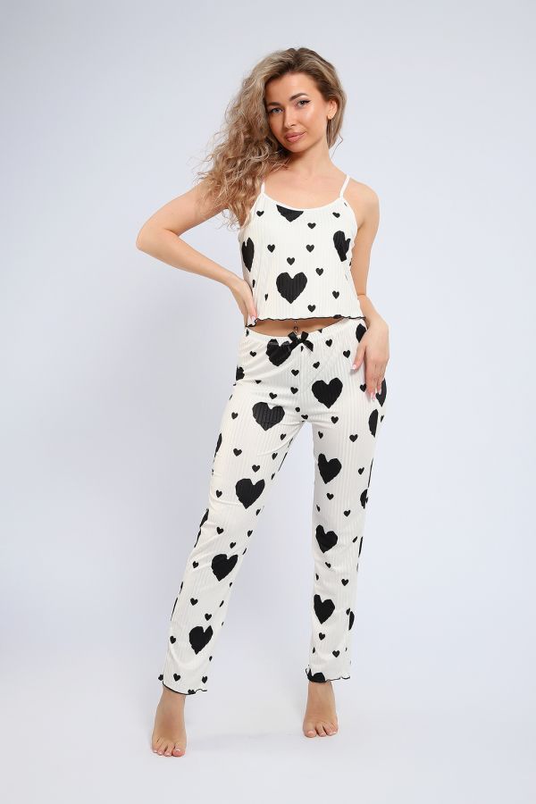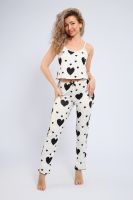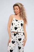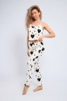 Женская пижама с брюками и топом — Она изготовлена из мягкого и приятного на ощупь материала, это идеальный выбор для тех, кто ценит комфорт и стиль в повседневной жизни. Эта модель представляет собой классическую комбинацию пижамы и штанов, выполненных из мягкого и приятного на ощупь материала, а принт в виде сердечек придаёт образу женственность и яркость. В целом, пижама создает милый и привлекательный образ. Каждый элемент этой пижамы тщательно продуман для максимального удобства. Топ имеет аккуратный вырез, а брюки обеспечивают свободу движений. Дизайн пижамы украшен милыми сердечками, что придаёт образу уют и теплоту. Этот домашний комплект идеально подходит для спокойных вечеров и утренних кофепитий. Он также станет прекрасным подарком для мамы, дочери или сестры. Пижама прекрасно сохраняет форму даже после многократных стирок. Она сочетает в себе стиль и практичность, подходит как для сна, так и для времяпрепровождения в кругу семьи или друзей.