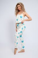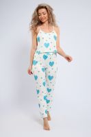 Женская пижама с брюками и топом — Она изготовлена из мягкого и приятного на ощупь материала, это идеальный выбор для тех, кто ценит комфорт и стиль в повседневной жизни. Эта модель представляет собой классическую комбинацию пижамы и штанов, выполненных из мягкого и приятного на ощупь материала, а принт в виде сердечек придаёт образу женственность и яркость. В целом, пижама создает милый и привлекательный образ. Каждый элемент этой пижамы тщательно продуман для максимального удобства. Топ имеет аккуратный вырез, а брюки обеспечивают свободу движений. Дизайн пижамы украшен милыми сердечками, что придаёт образу уют и теплоту. Этот домашний комплект идеально подходит для спокойных вечеров и утренних кофепитий. Он также станет прекрасным подарком для мамы, дочери или сестры. Пижама прекрасно сохраняет форму даже после многократных стирок. Она сочетает в себе стиль и практичность, подходит как для сна, так и для времяпрепровождения в кругу семьи или друзей.