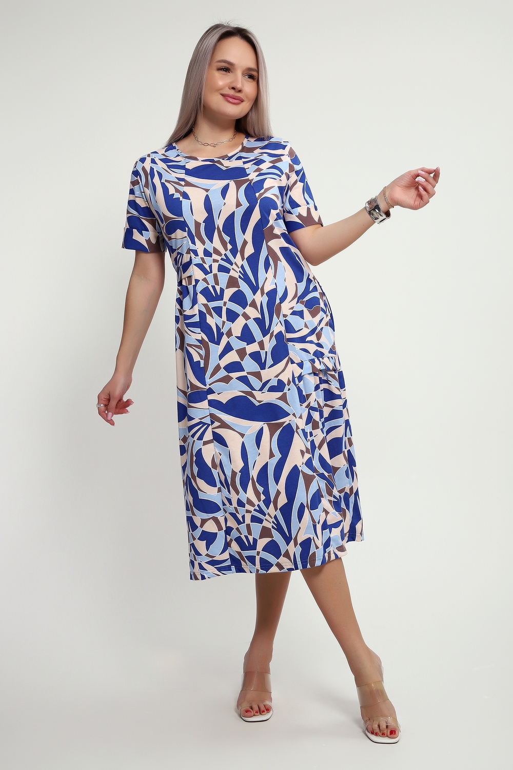 Платье женское свободного силуэта выполнено из 100% хлопка. Платье с коротким рукавом, с карманами в боках, спереди оригинальные ассиметричные планки. Изделие идеально подойдет как для дома, так и для прогулок и отдыха.