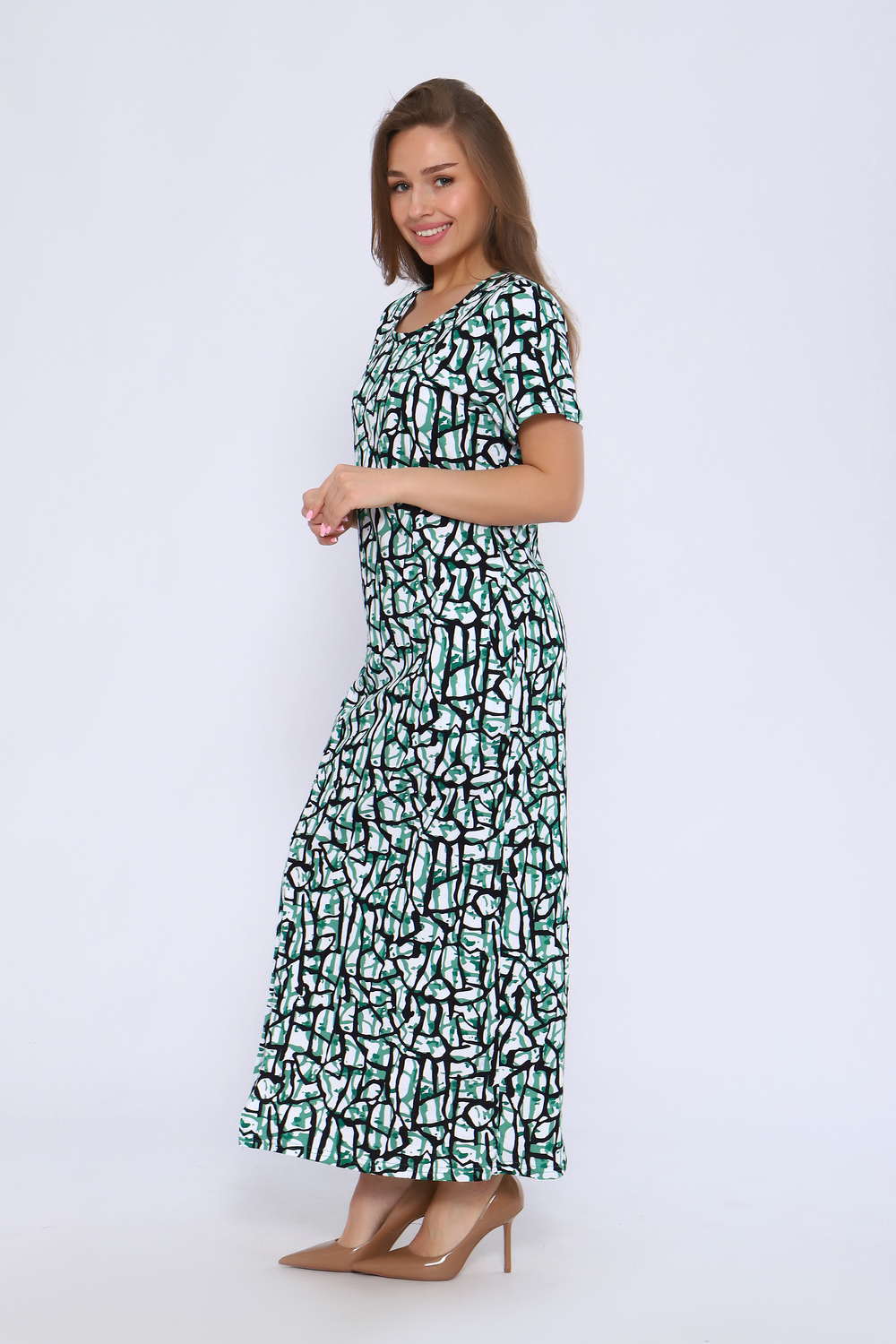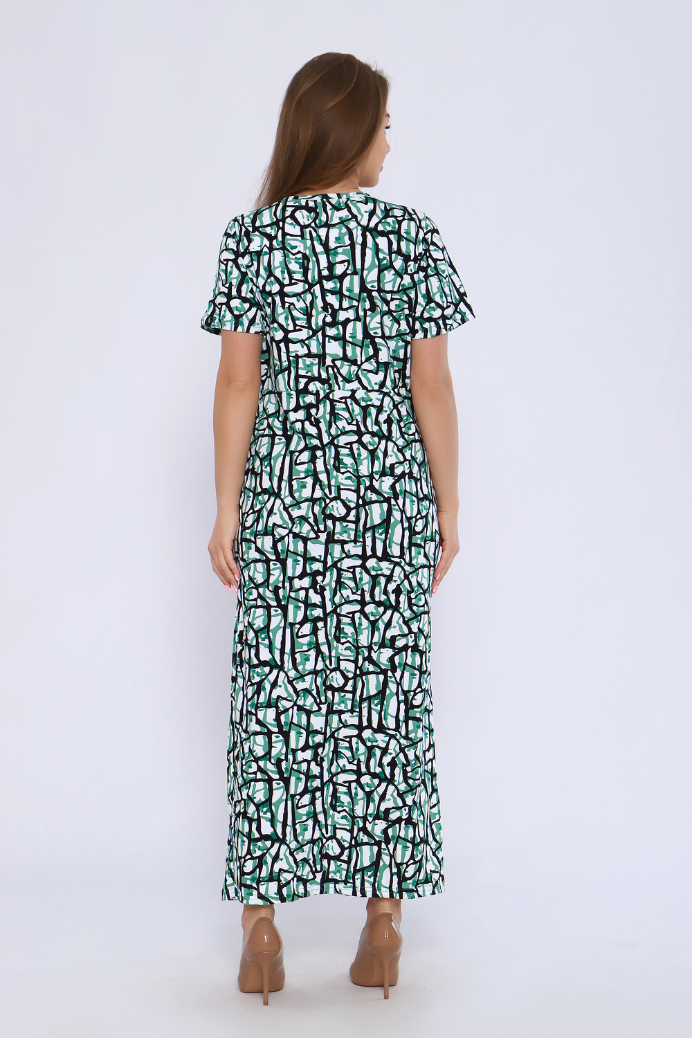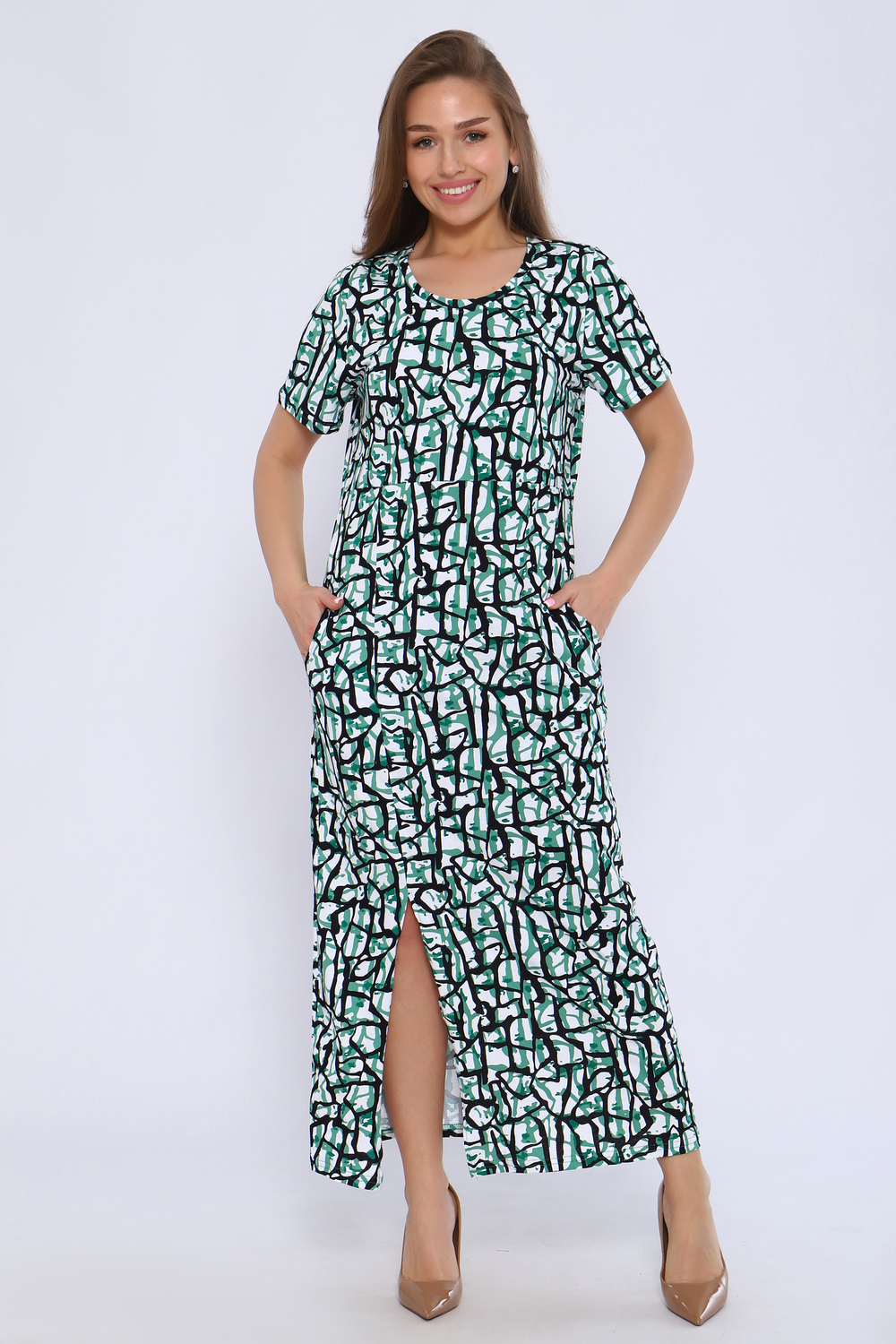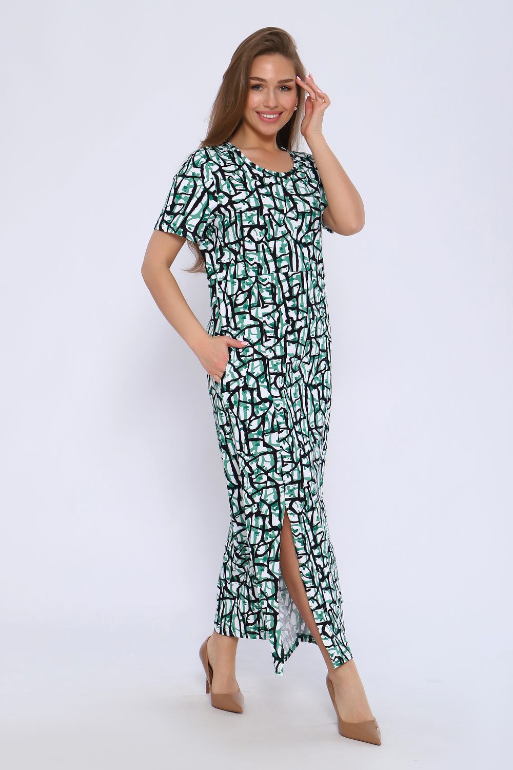 Длинное платье полуприлегающего силуэта с короткими рукавами. Спереди разрез на ноге. В боковых швах карманы.