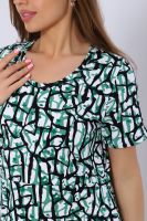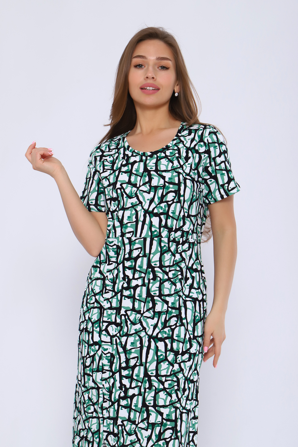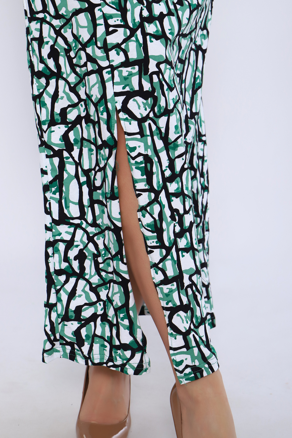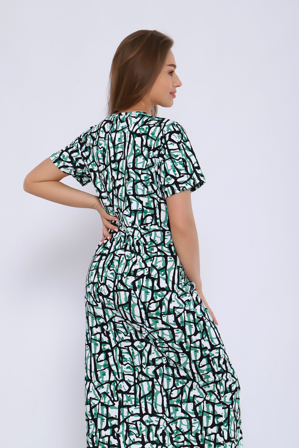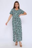 Длинное платье полуприлегающего силуэта с короткими рукавами. Спереди разрез на ноге. В боковых швах карманы.