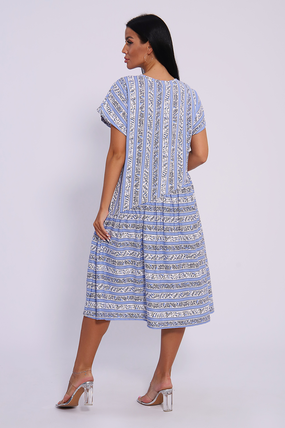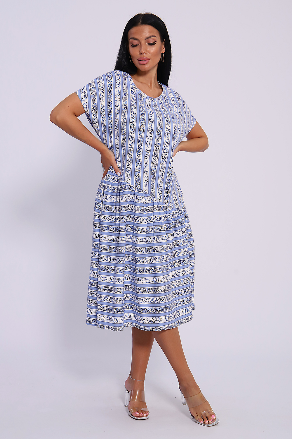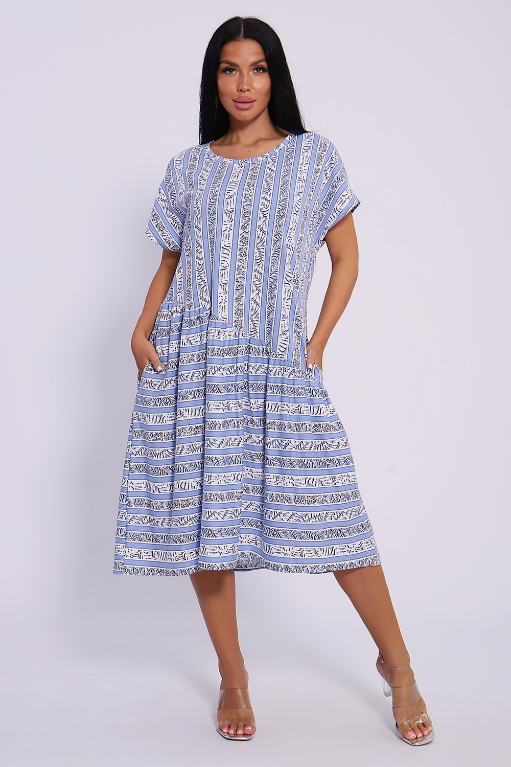 Платье свободного кроя со спущенным плечом. Полочка и спинка разрезаны по косой от талии слева вниз. Нижние детали на сборке. В боковых швах карманы.