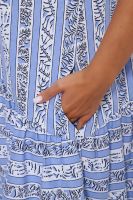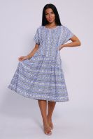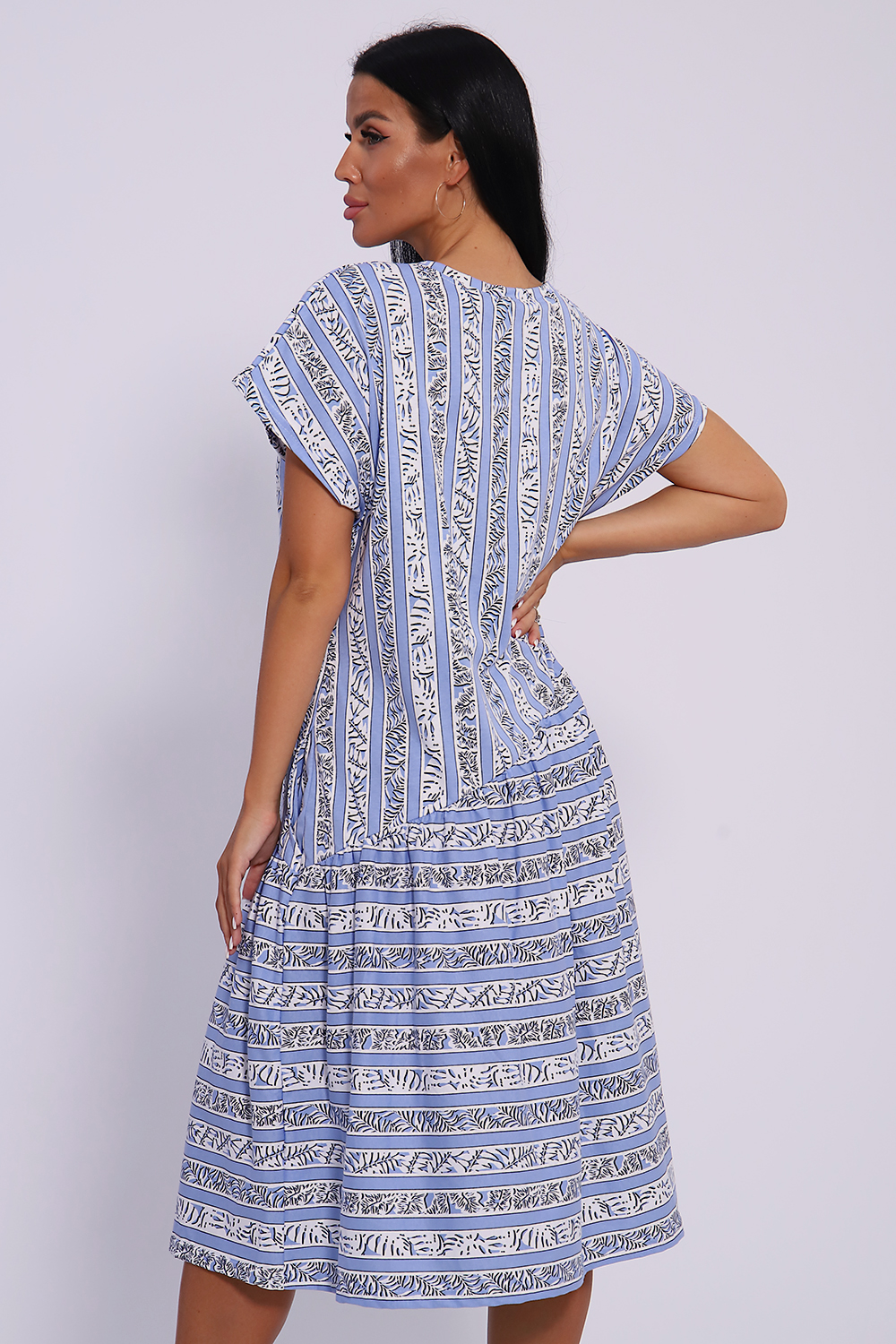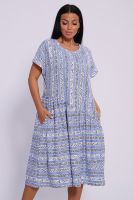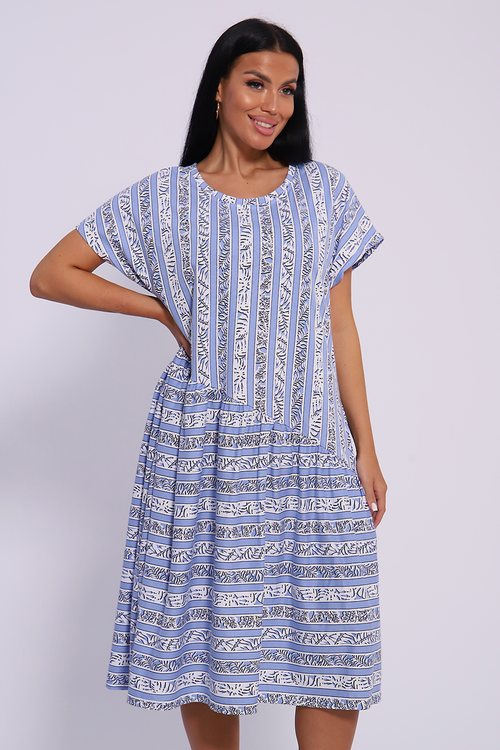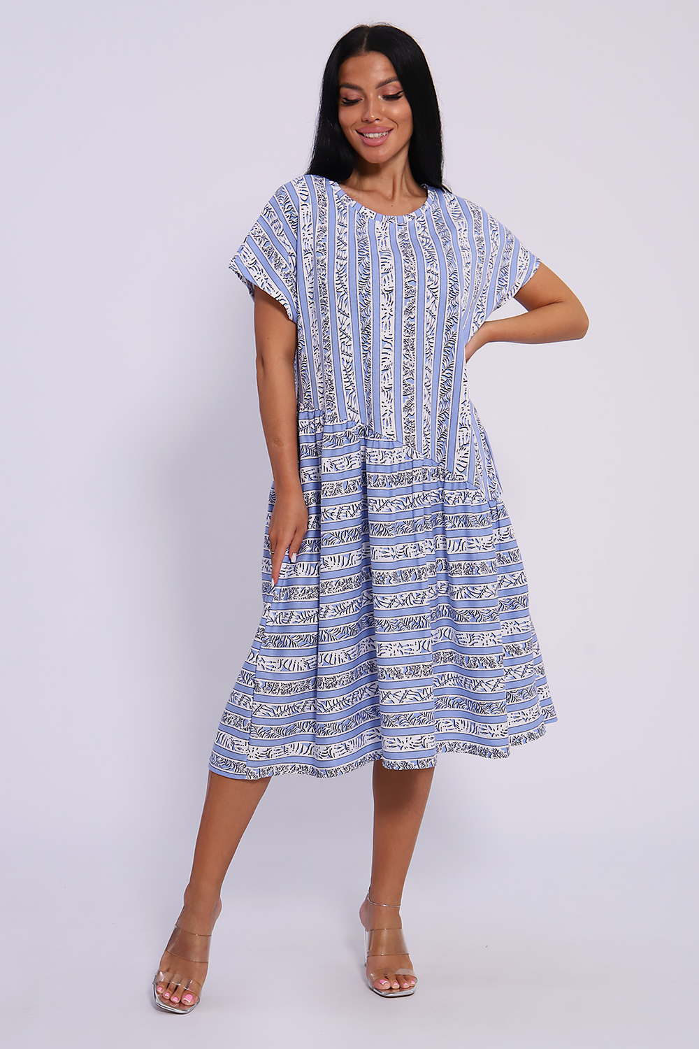 Платье свободного кроя со спущенным плечом. Полочка и спинка разрезаны по косой от талии слева вниз. Нижние детали на сборке. В боковых швах карманы.