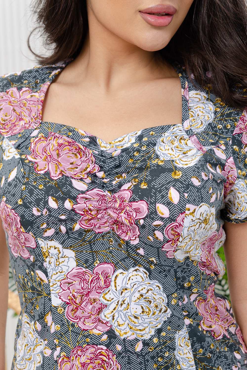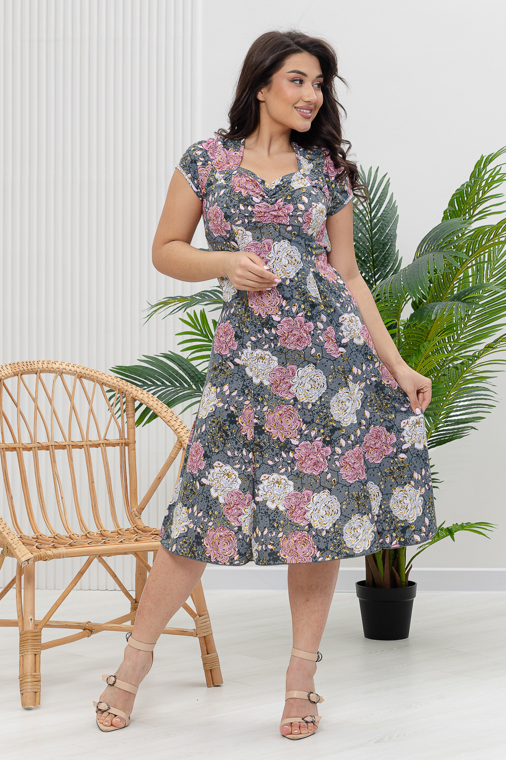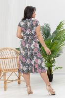 Легкое летнее платье из кулирки. Три варианта дизайна — пионы, орхидеи и сакура, рукава короткие, общая длина платья чуть ниже коленей. Размеры от 48 до 66.