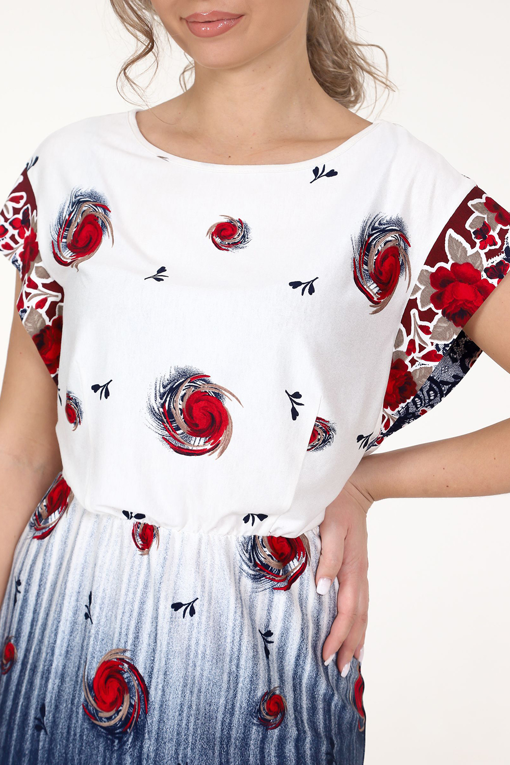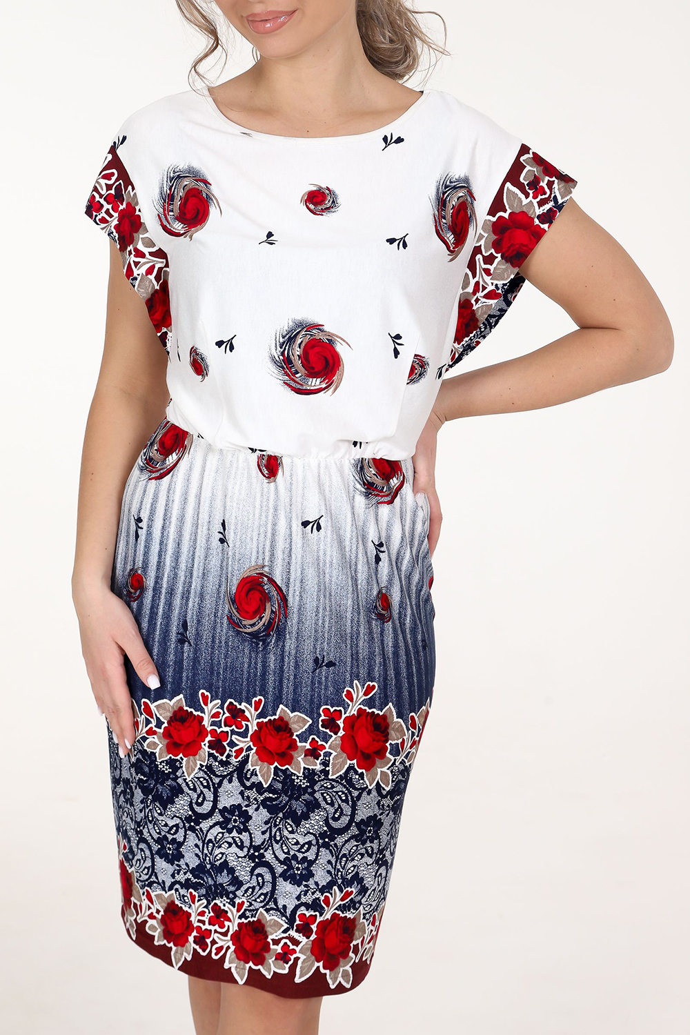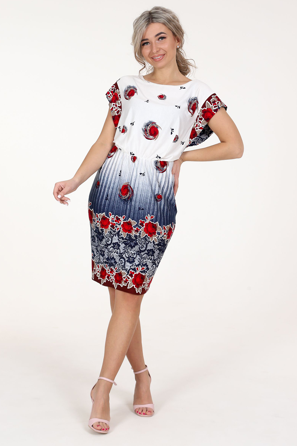 Платье женское из вискозы. Платье свободного покроя, на резинке в области талии. Рукав спущенный, в виде крыла. Горловина окантована.