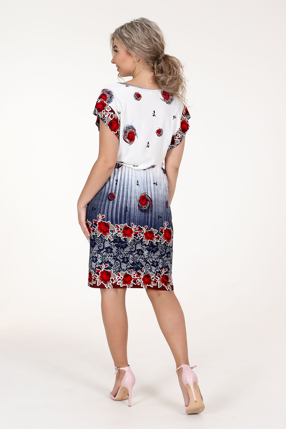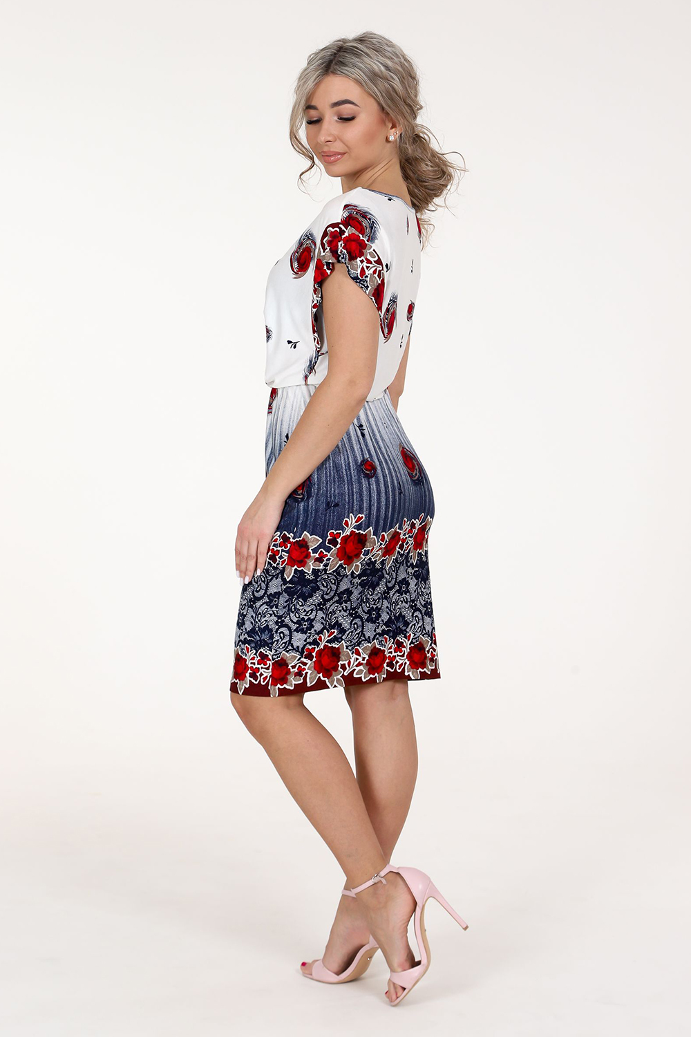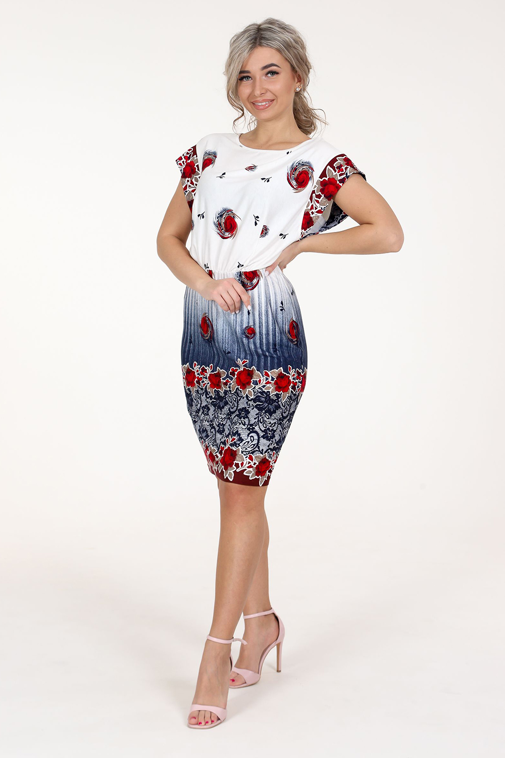 Платье женское из вискозы. Платье свободного покроя, на резинке в области талии. Рукав спущенный, в виде крыла. Горловина окантована.