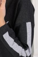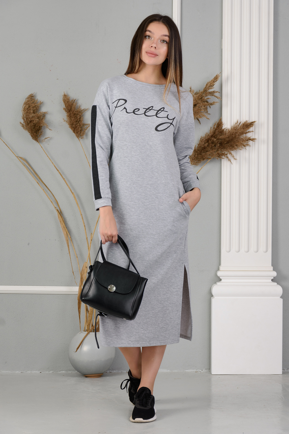 Платье с принтом в спортивном стиле, слегка приталенного силуэта, миди длиной, с разрезом снизу. Горловина в виде лодочки, обработана обтачкой, спущенная пройма, рукава с лампасами длинные на манжете, в боковых швах удобные карманы. Комфортное, практичное платье подойдёт для любой фигуры и возраста.