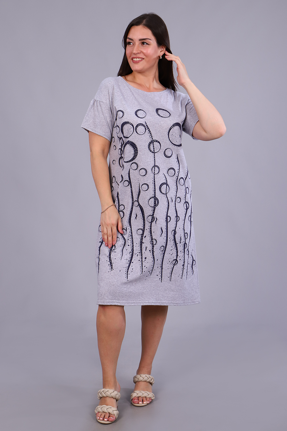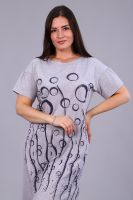 Платье женское с принтом из приятного к телу трикотажа. Модель полуприлегающего силуэта, круглая горловина, спущенное плечо, фигурная пройма, короткий слегка присборенный свободный рукав. Уютное, мягкое платьице необходимая вещь в гардеробе любой женщины, подойдёт для дома, отдыха и приятных прогулок.