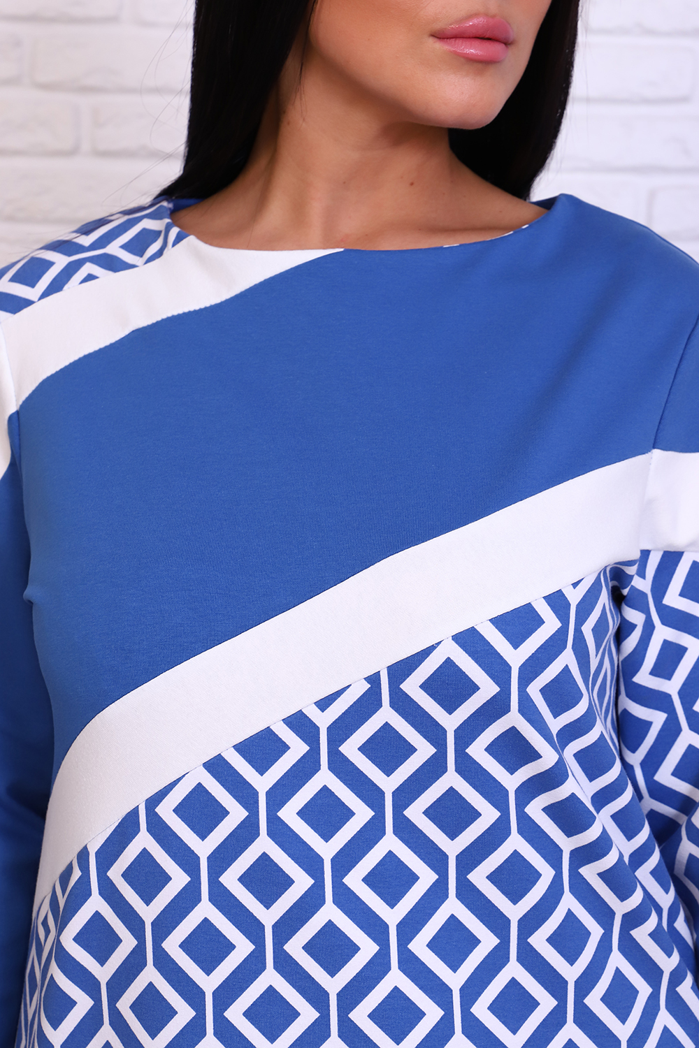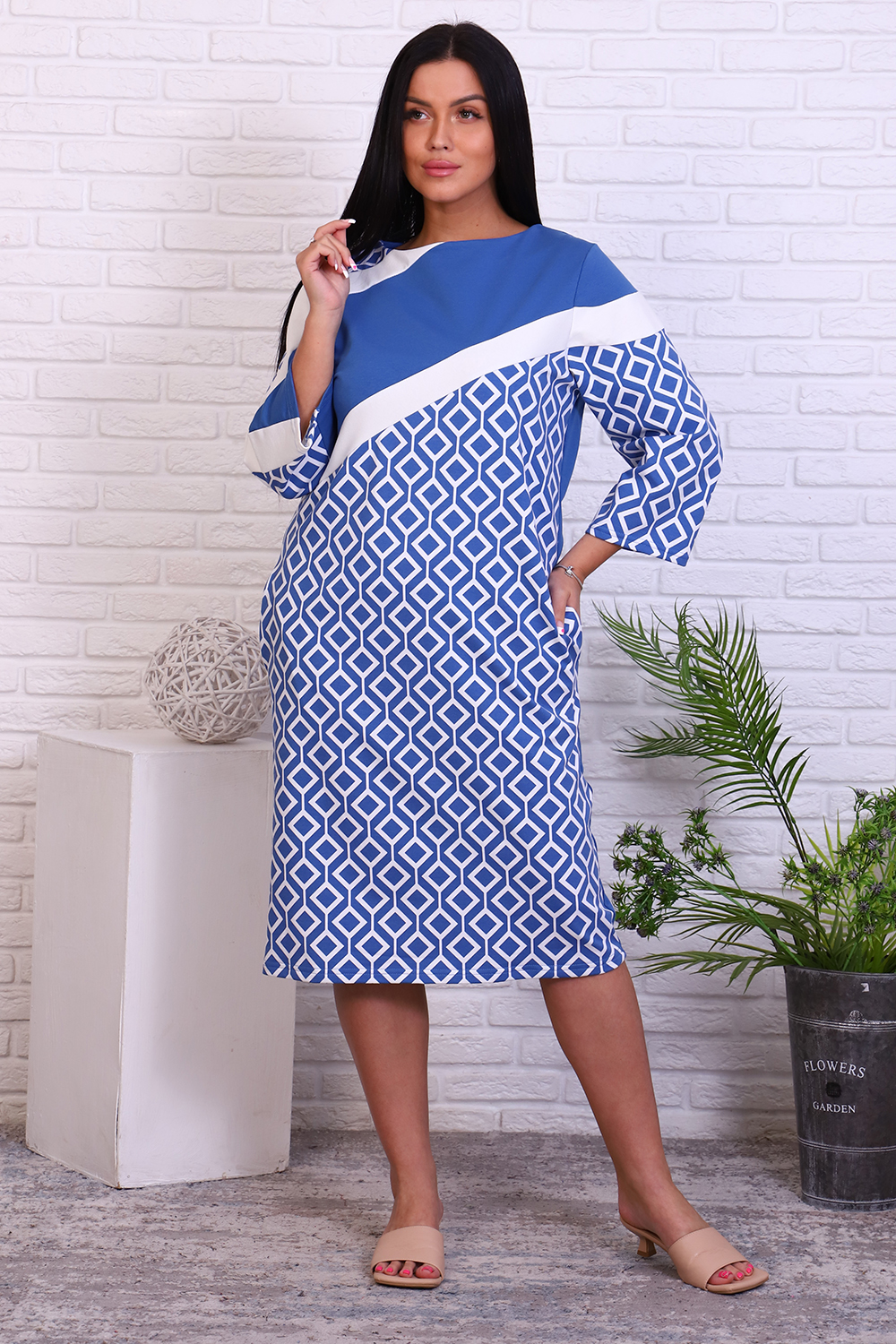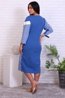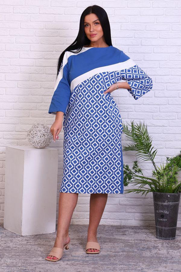 Элегантное женское платье оригинального кроя из комбинированного футера. Платье прямого силуэта с карманами в боковых швах. На полочке и рукавах декоративные вставки однотонного цвета. Рукав 3/4. Платье подойдет как для офиса, так и для выхода в ресторан.