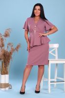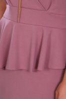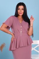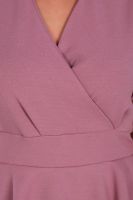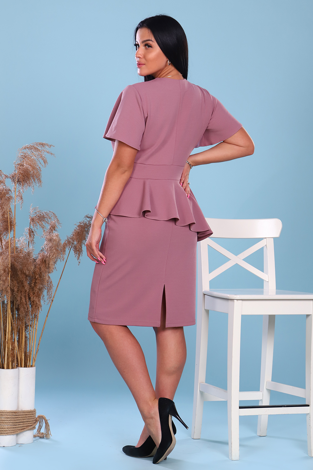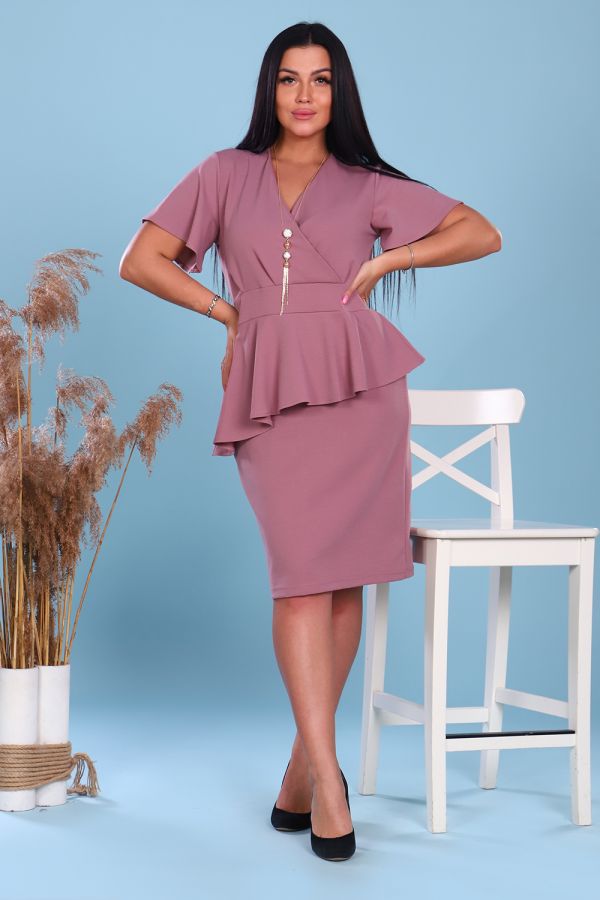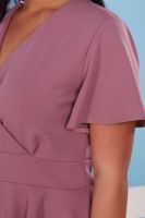 Женское платье с вырезом на груди, рукав короткий свободный. Спереди и сзади волан по талии