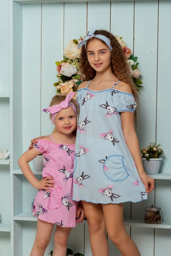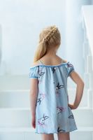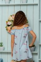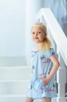 Платье детское летнее с двумя накладными кармашками на полочке. Свободного А-силуэта на тонких бретелях. По горловине и рукавам настрочена декоративная ажурная резинка. Все срезы в изделии обработаны декоративной краеобметочной строчкой.