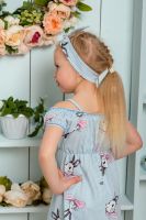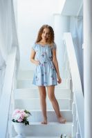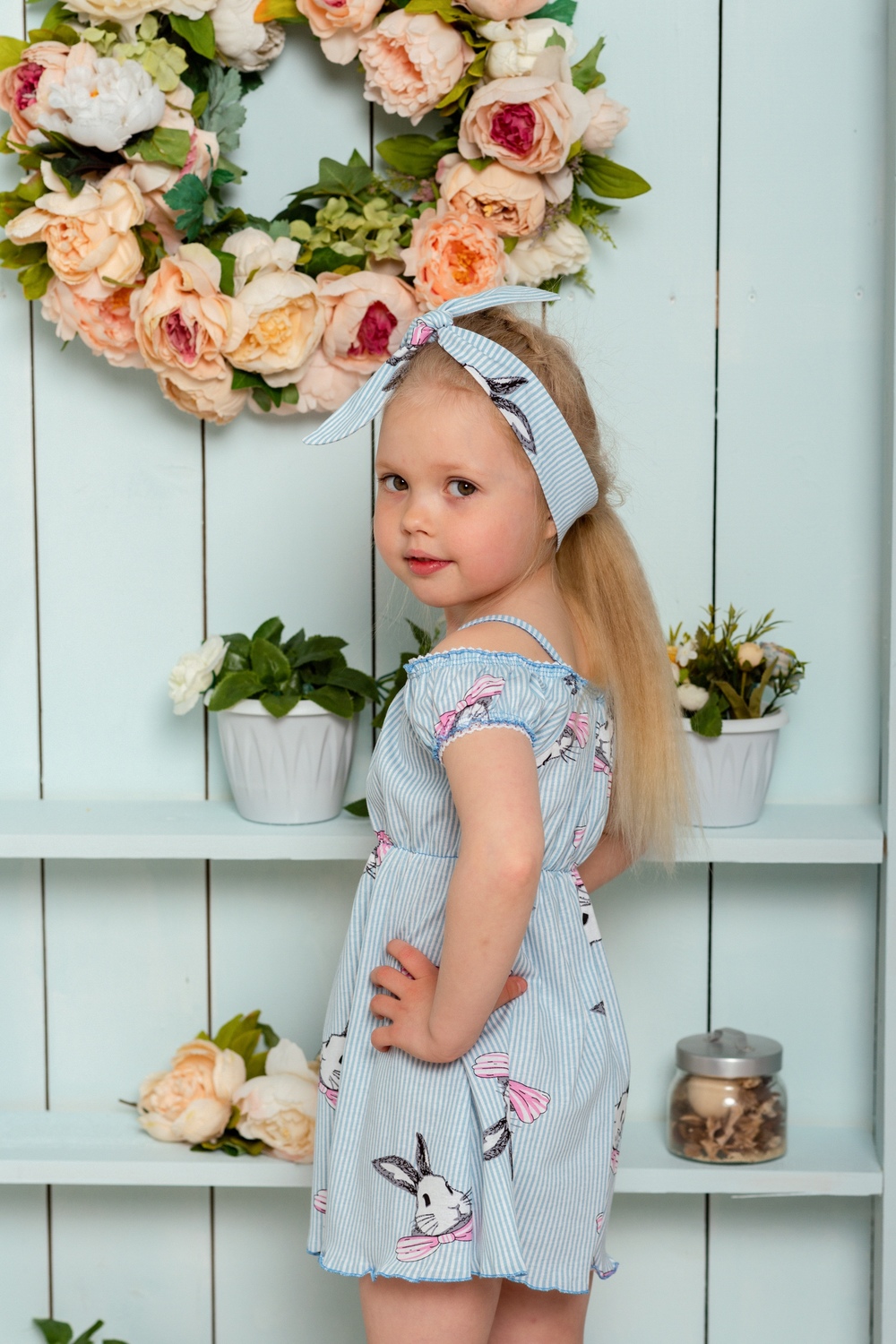 Платье детское летнее для девочек. Приталенного силуэта, на тонких бретелях, с накладным кармашком на полочке. По горловине, рукавам настрочена декоративная ажурная резинка. Линия талии собрана на потайную эластичную резинку. Все срезы в изделии обработаны декоративной краеобметочной строчкой.