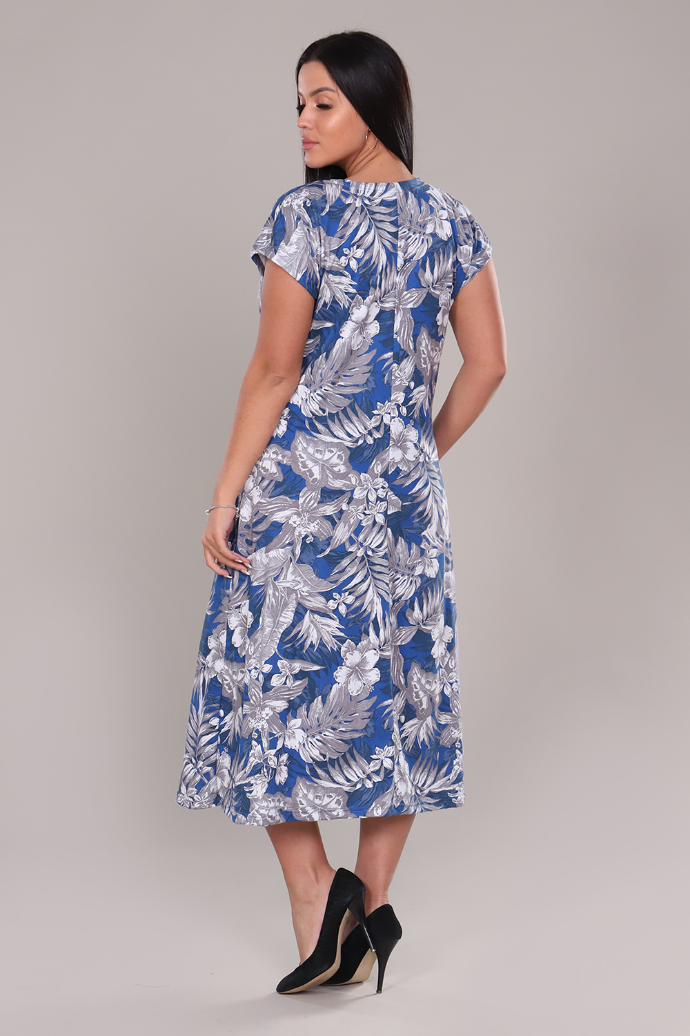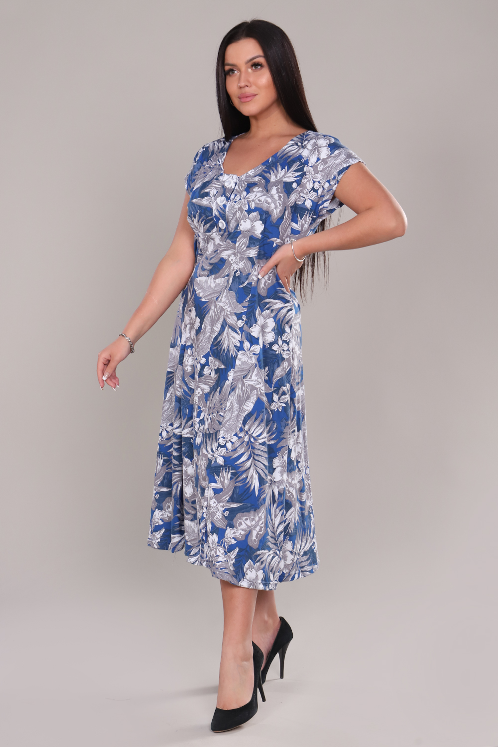 Платье женское удлиненное со спущенным рукавом, на полочке подрез, планка на трех декоративных пуговицах, внизу расклешение. Рисунок ткани красивый, насыщенный. Модель придает легкость, изящность, подойдет на каждый день, для прогулки и дома.