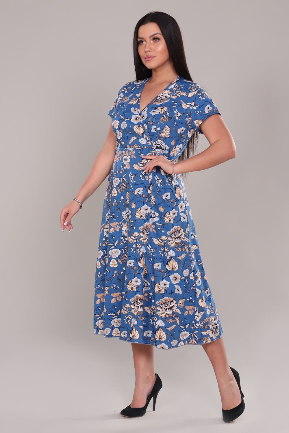 Платье женское очень красивой и оригинальной расцветки выполнено из ткани хлопок. Платье удлиненное, приталенное, с расклешением к низу. Вырез платья V-образный за счет запаха на полочке, что придает изделию элегантность и комфорт. Модель подойдет для прогулок, отдыха и дома.