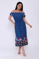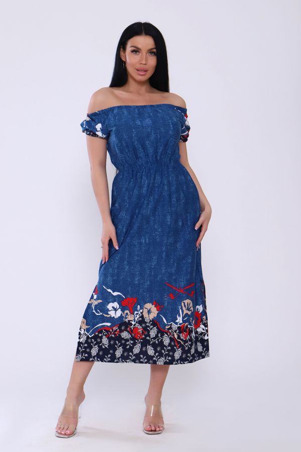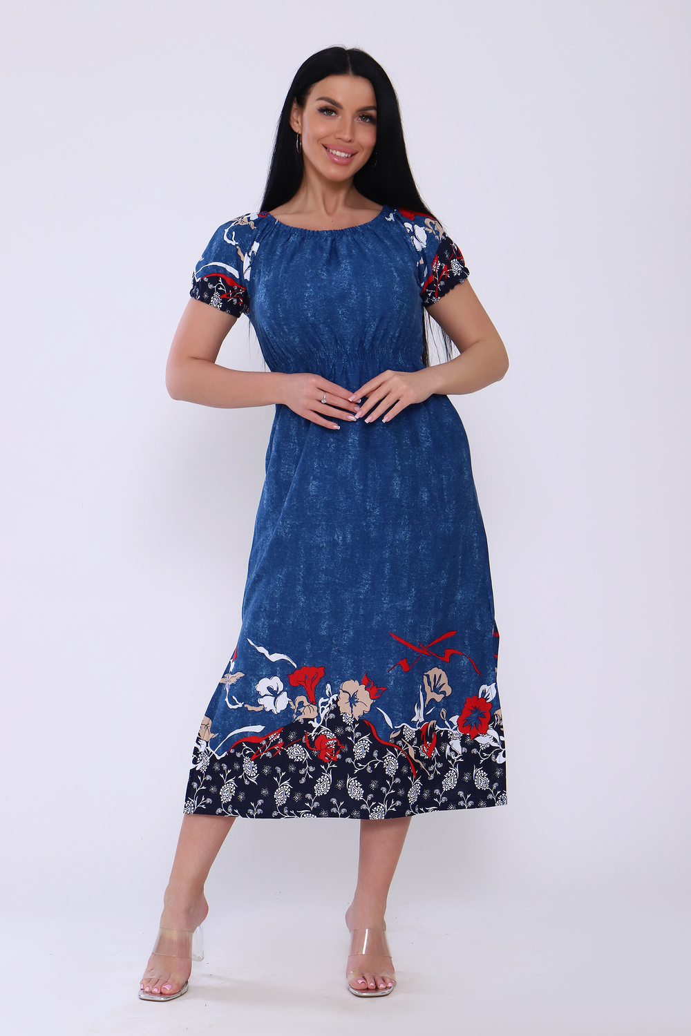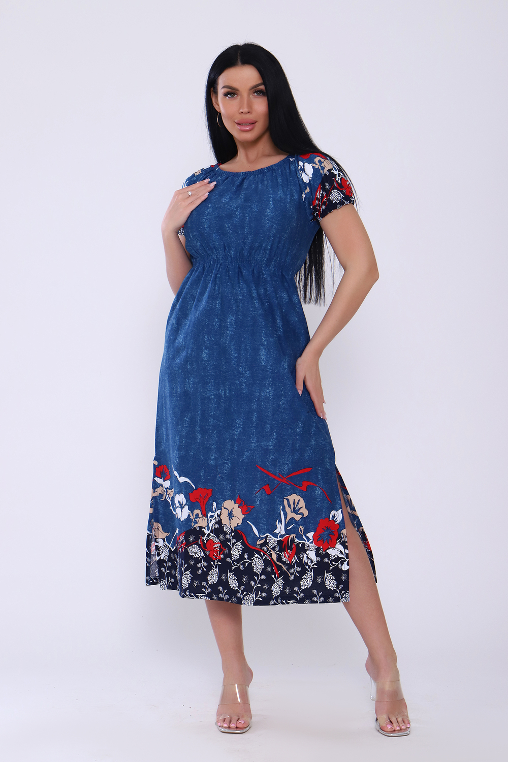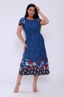 Женское платье свободного кроя с небольшими рукавами регланами, собранными на резинке. Завышенная линия талии собрана на тонкую резинку в три ряда. Длина ниже средней. Горловина присобрана на тонкой резинке. По боковым швам внизу разрезы. Подходит для домашнего и повседневного ношения.