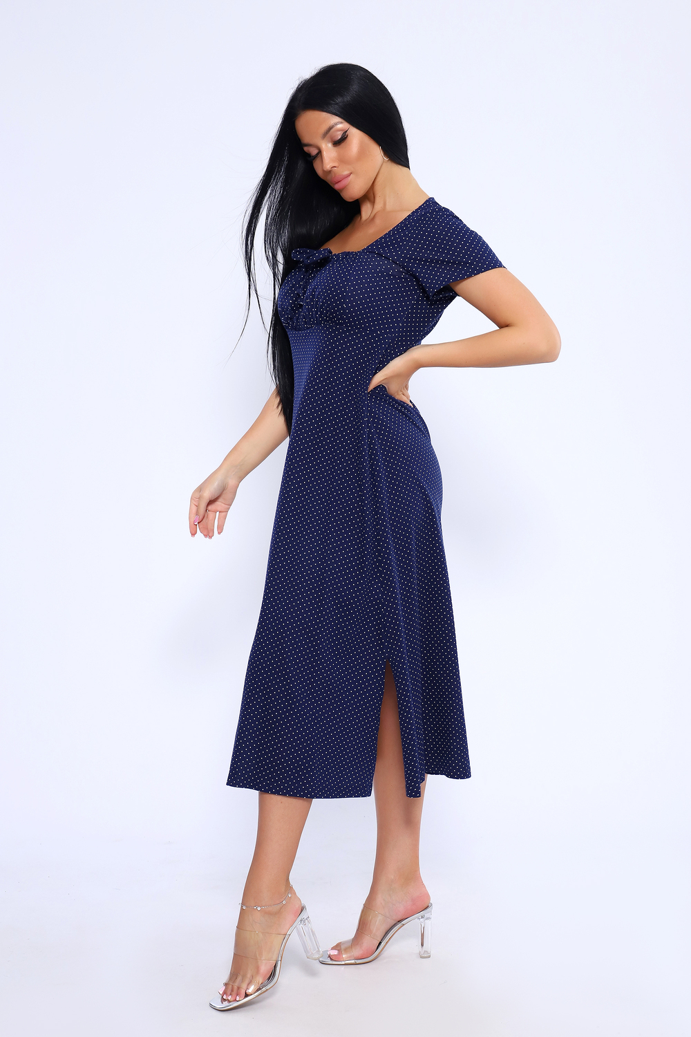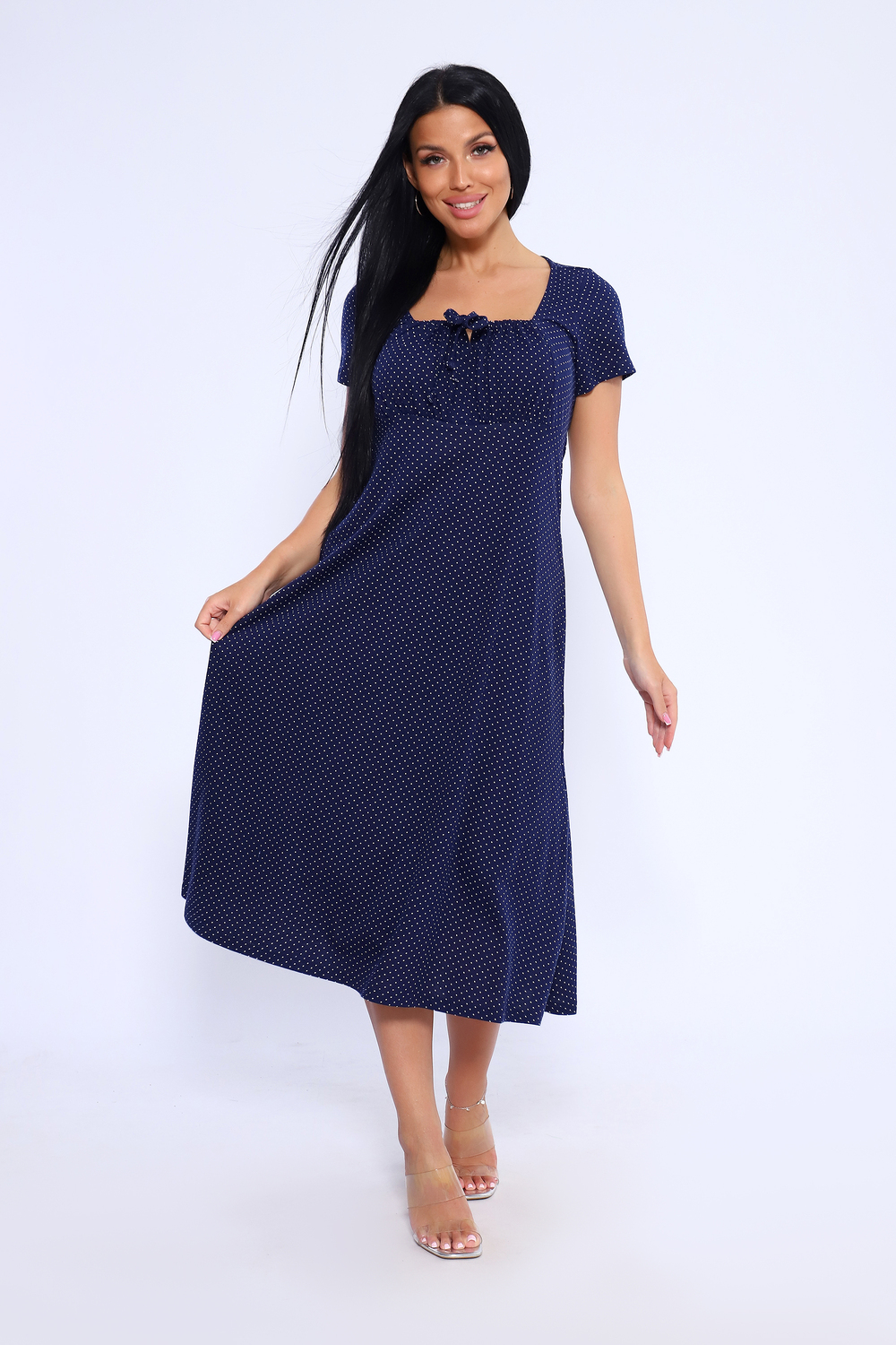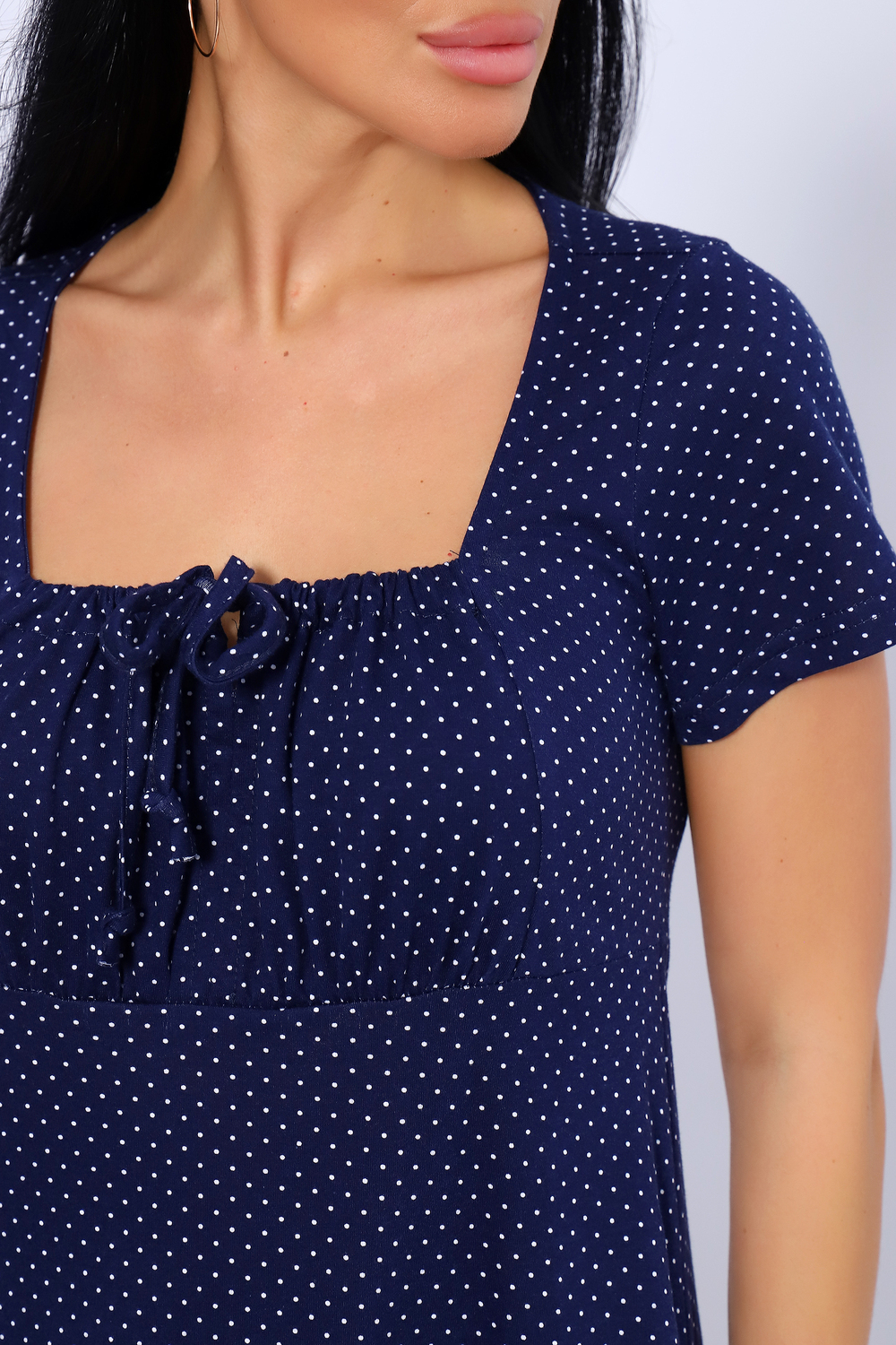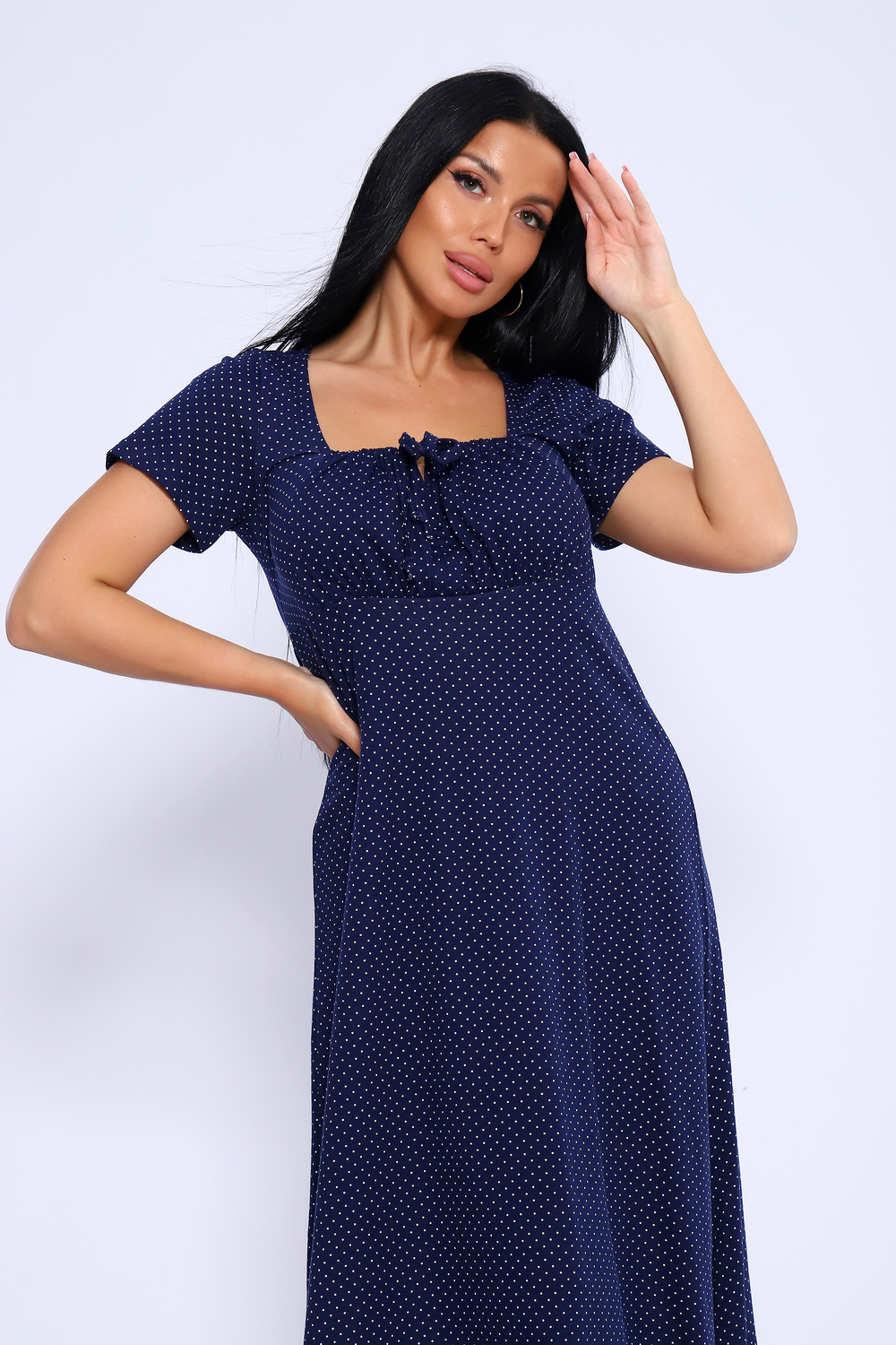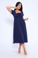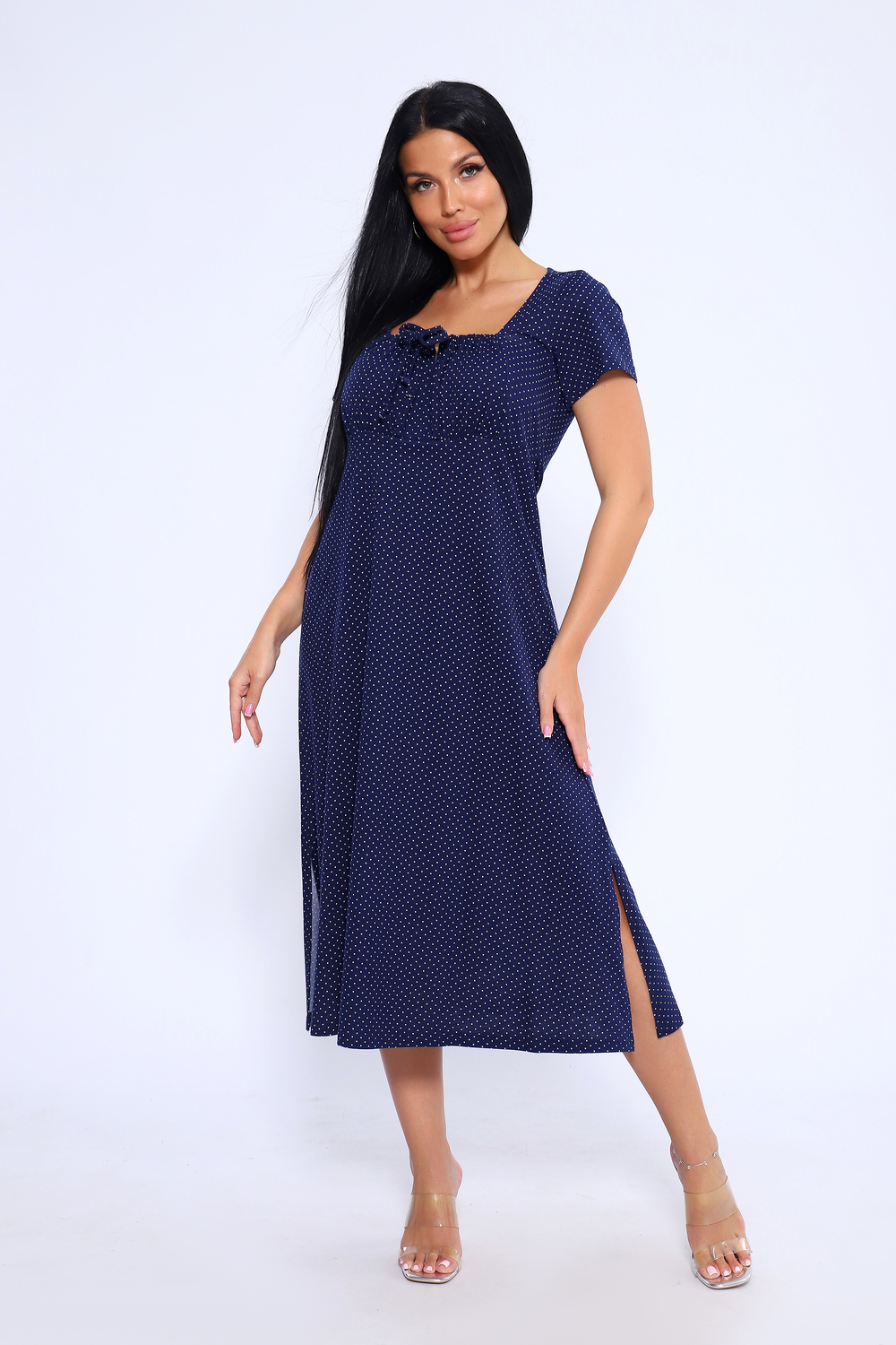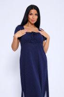 Длинное романтичное платье с короткими рукавами, декорировано квадратным вырезом декольте с завязками на груди. Милое, воздушное платье ниже колена с разрезами по боковым швам. Платье имеет свободный крой А-силуэта, который подходит для разного типа фигуры. Модель подойдет для прогулок, отдыха на пляже. Параметры модели 165 см,97-71-101 На модели представлен 46 размер.