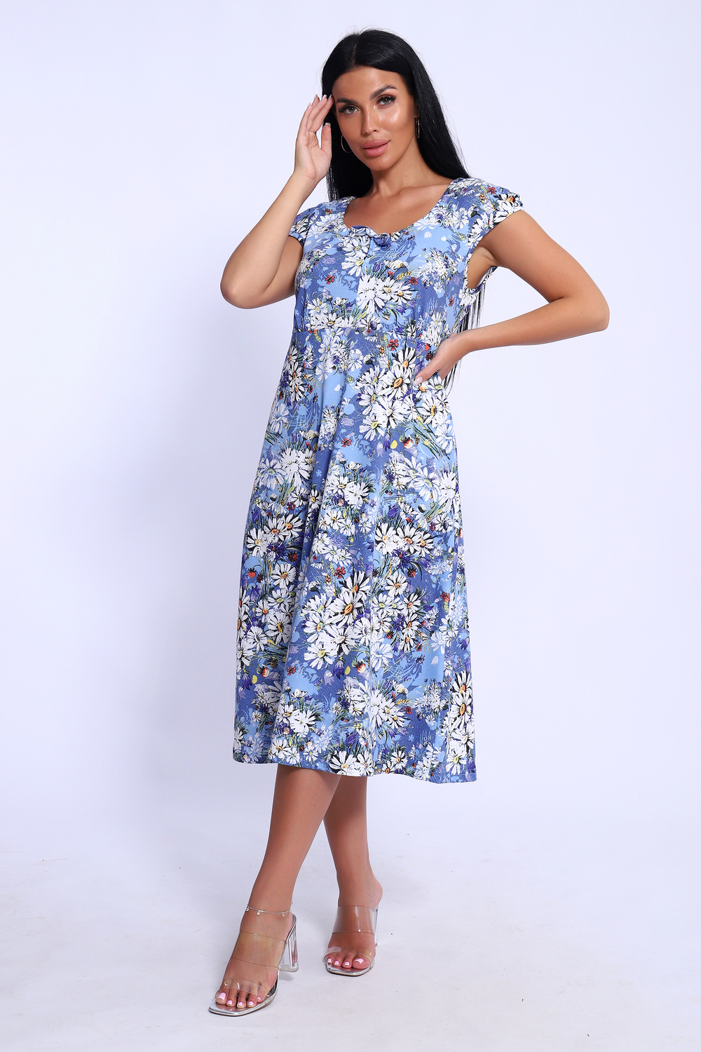 Подчеркните свой стиль с помощью этого красивого и модного летнего платья-сарафана. Это универсальное платье, которое подойдет для дома, прогулок на свежем воздухе, отдыха на пляже, отпуска на море. Элегантный вырез с завязками декольте подчеркнет красоту вашей груди, а яркие и сочные расцветки поднимут настроение и привлекут внимание. Нарядное воздушное платье-сарафан имеет универсальную длину миди, оно не длинное, не короткое. Сочетайте с босоножками, кедами или сандалиями. В замерах в колонке "Длина рукава" представлен замер длины плеча, "Объем бедер" - обхват низа. Параметры модели 165 см,97-71-101 На модели представлен 46 размер.