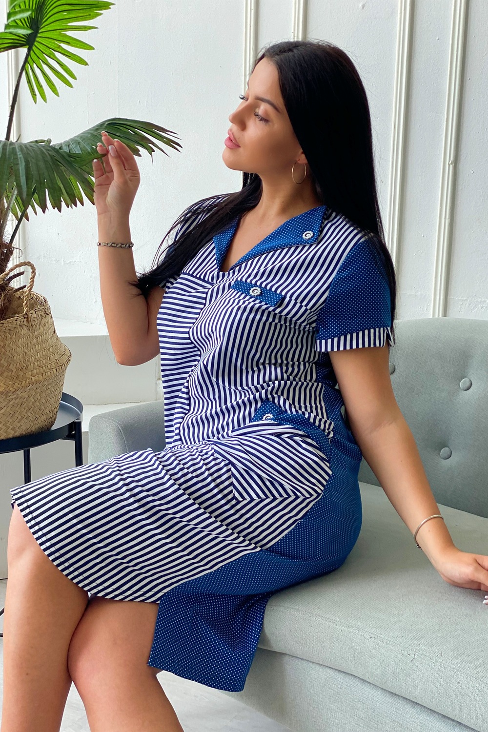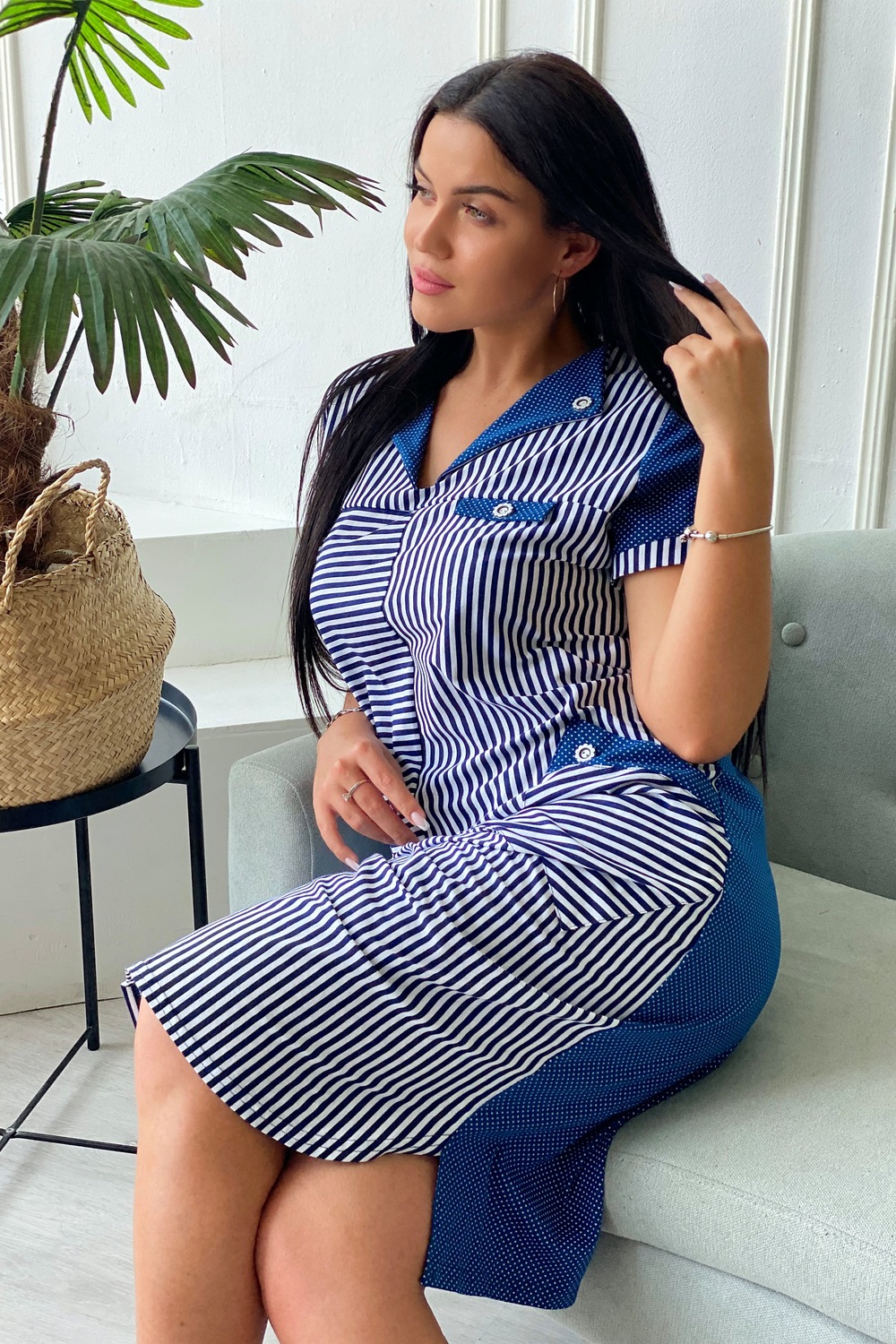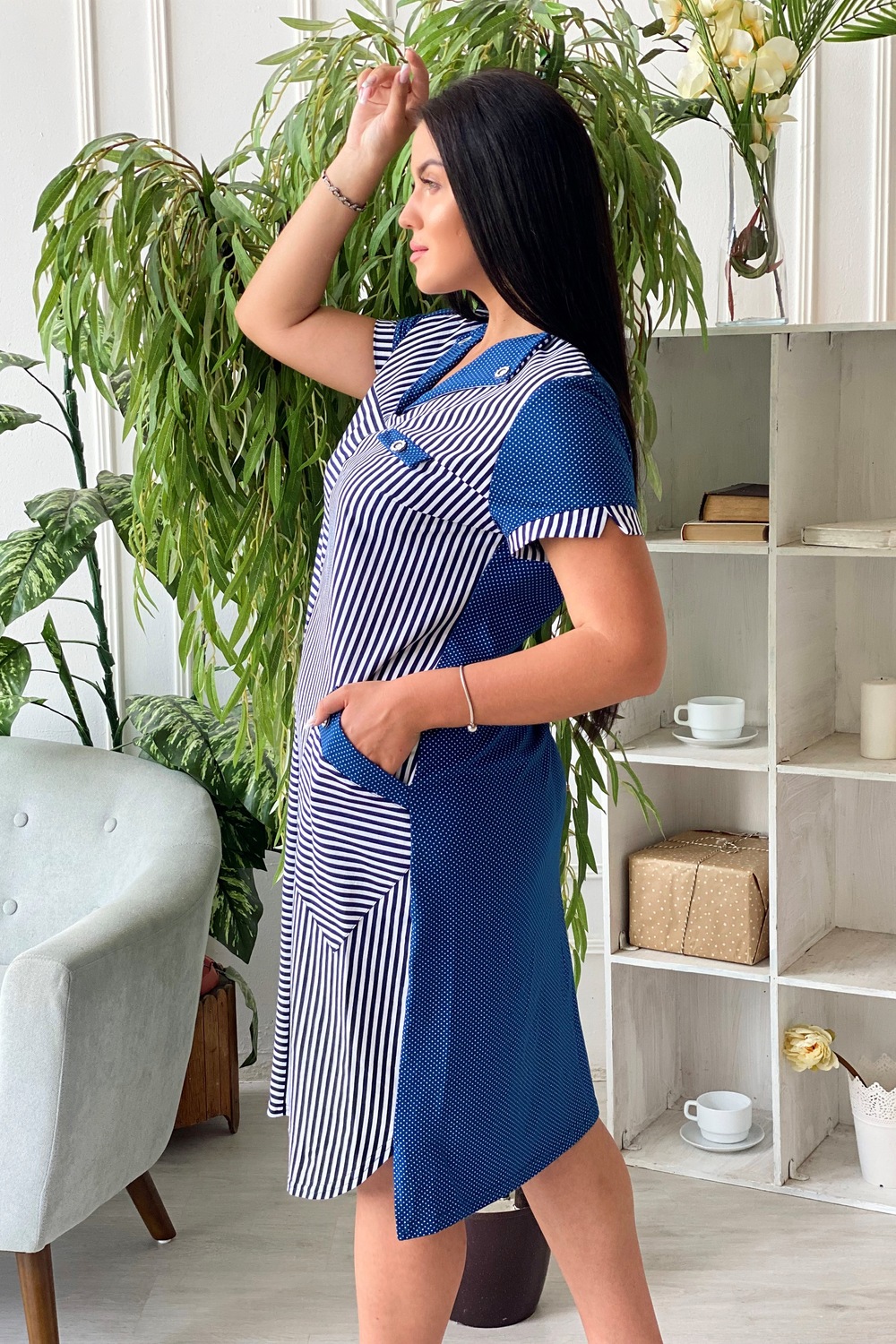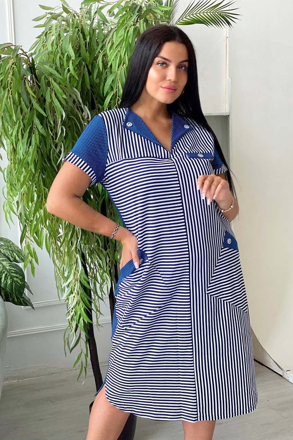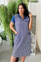 Платье женское полуприлегающего силуэта. Полочка с отложным воротником, двумя накладными карманами.