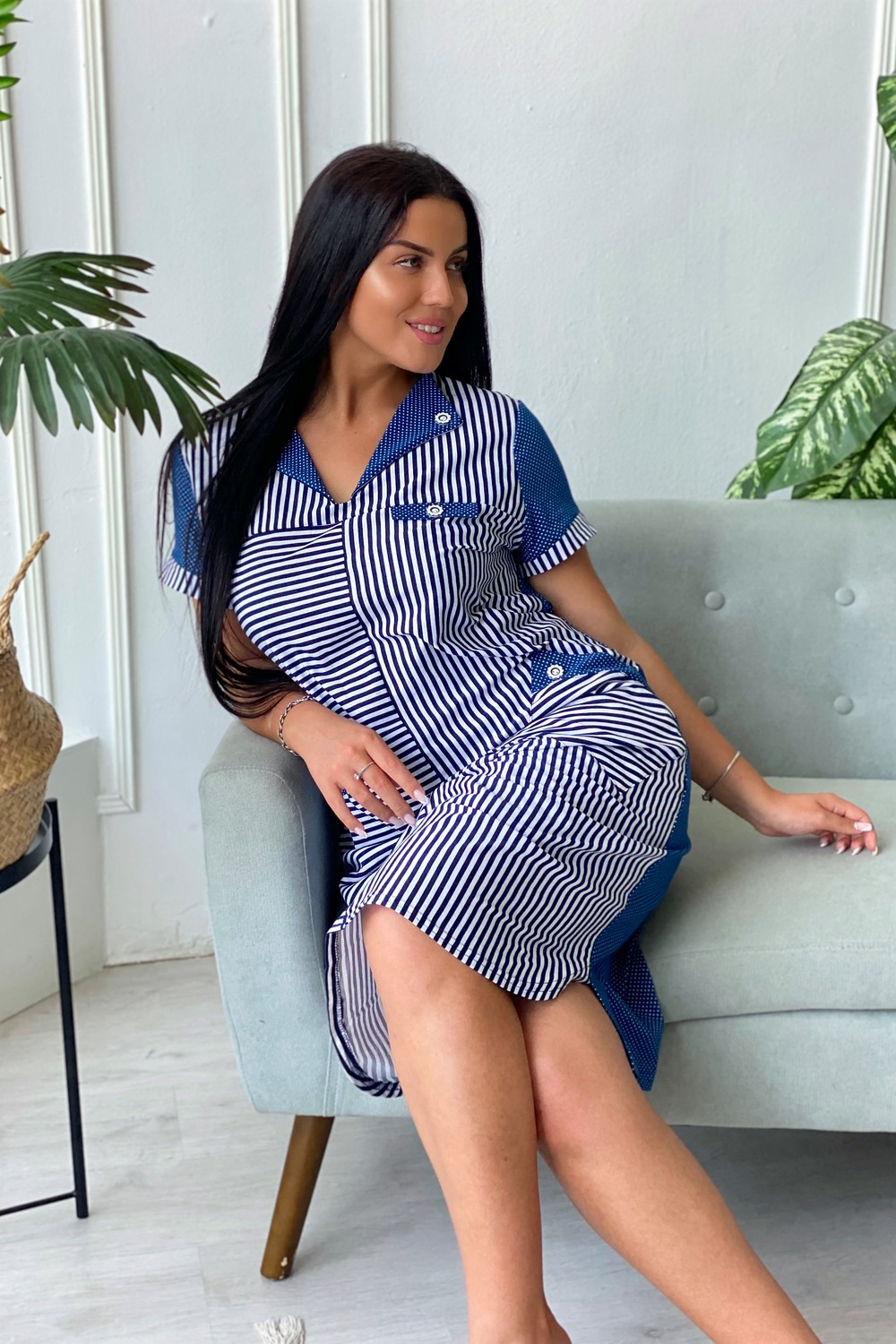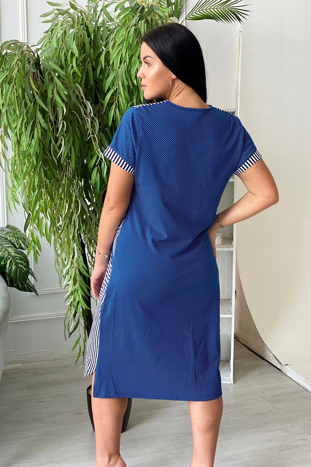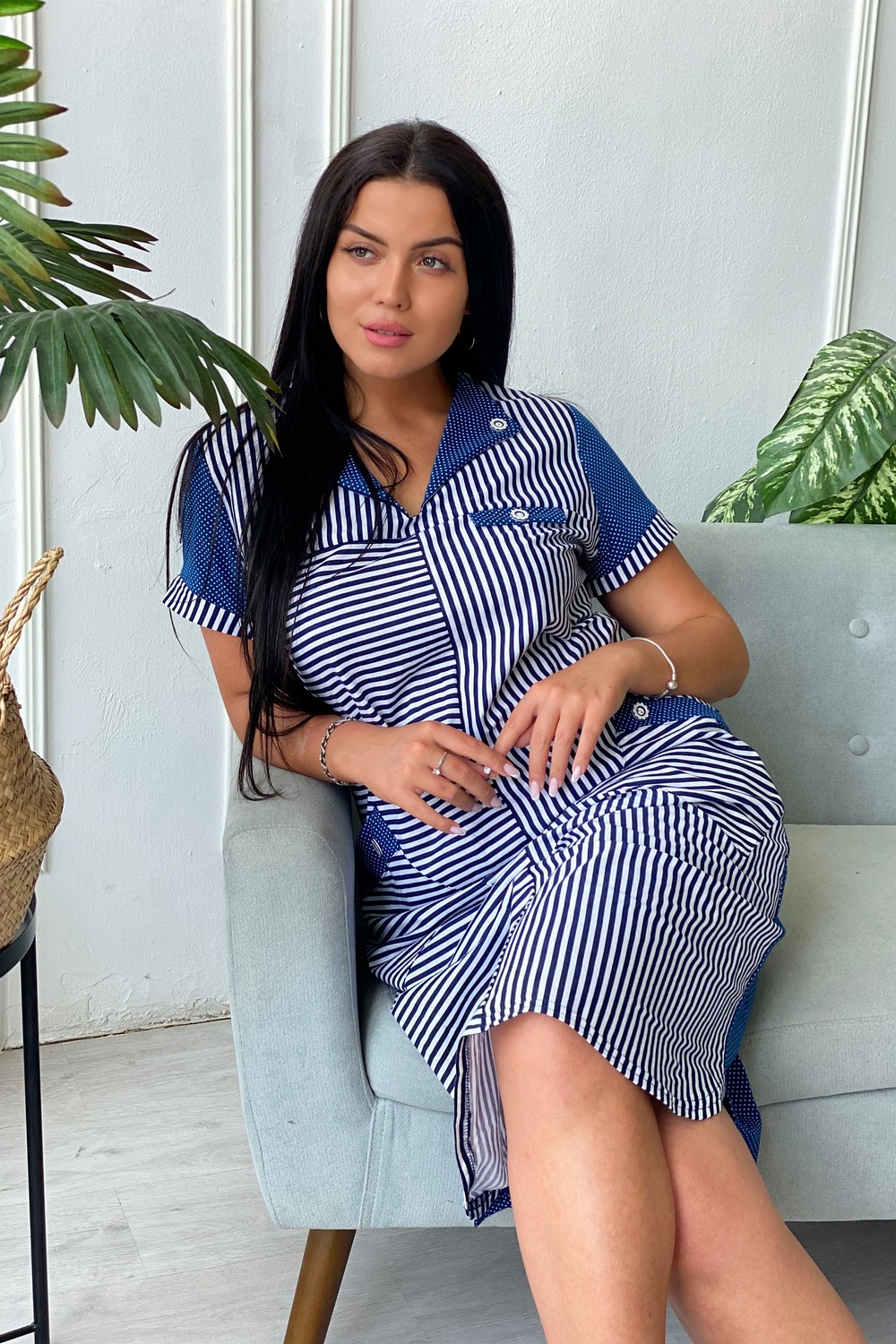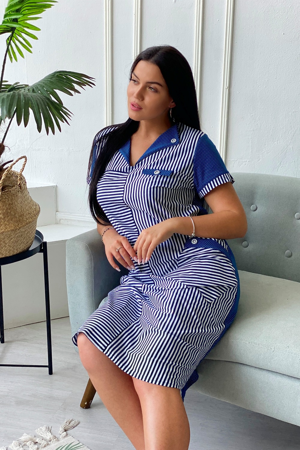 Платье женское полуприлегающего силуэта. Полочка с отложным воротником, двумя накладными карманами.
