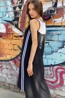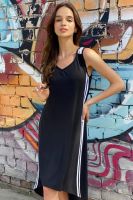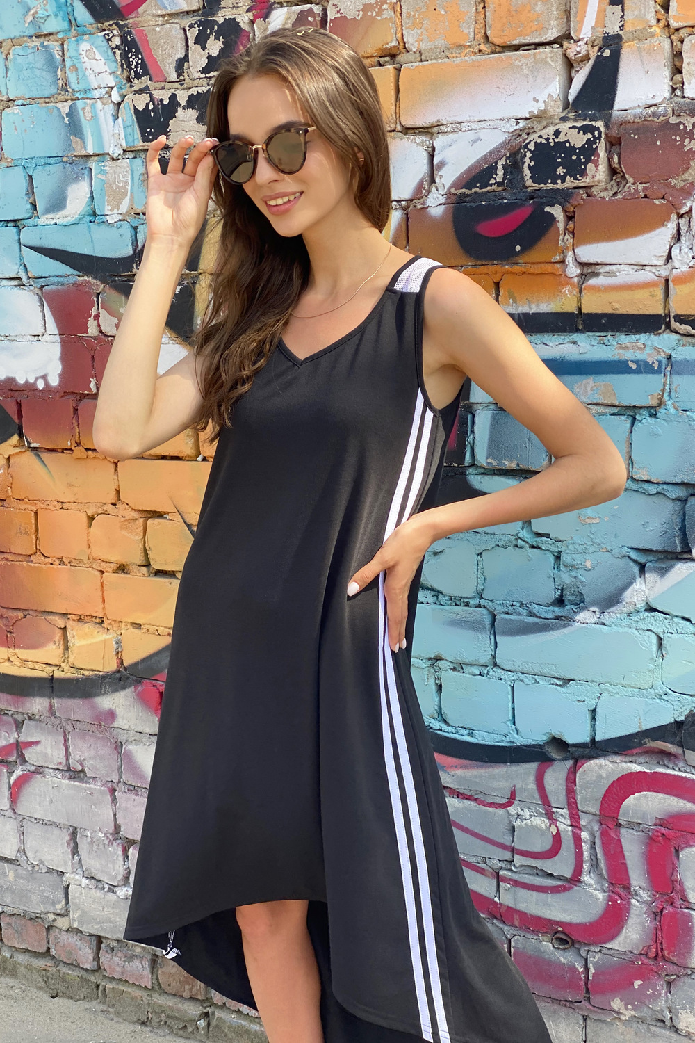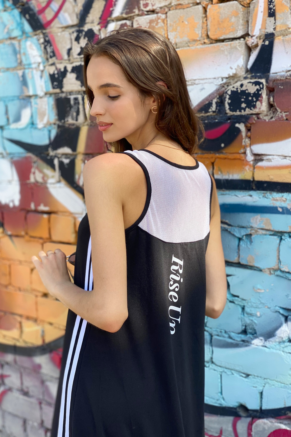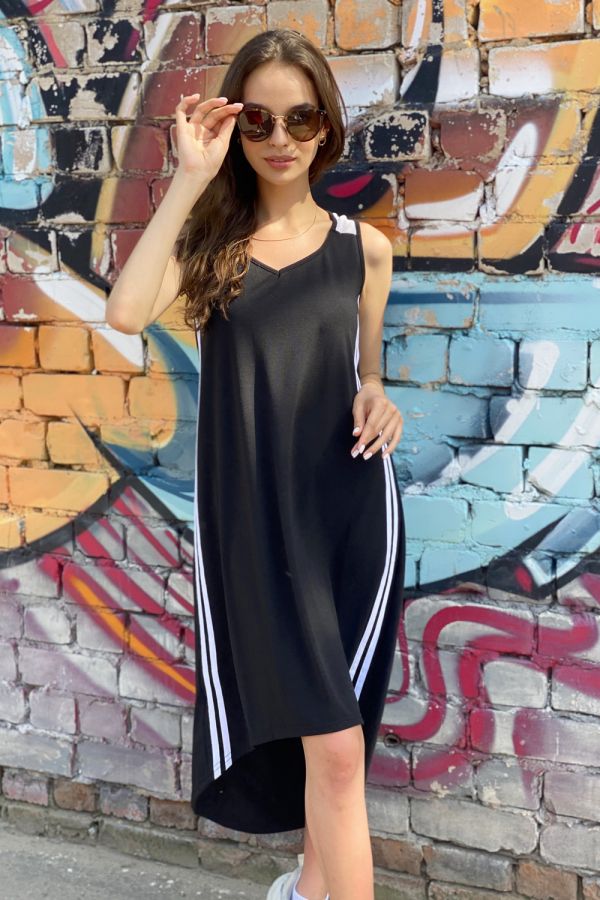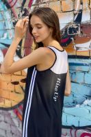 Сарафан в спортивном стиле, трапециевидного силуэта, с V-образной горловиной, с удлиненной асимметричной линией низа. В верхней части спинки расположена кокетка из сетки. Вдоль боковых швов расположены лампасы контрастного цвета. Горловина и проймы обработаны бейкой из основного полотна.