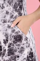 Платье прямое, длинное, с капюшоном, с карманом "кенгуру". Рукав короткий, с лампасами из отделочного полотна. Полочка с лампасами из отделочного полотна вдоль боковых швов. В нижней части боковых швов обработаны разрезы.