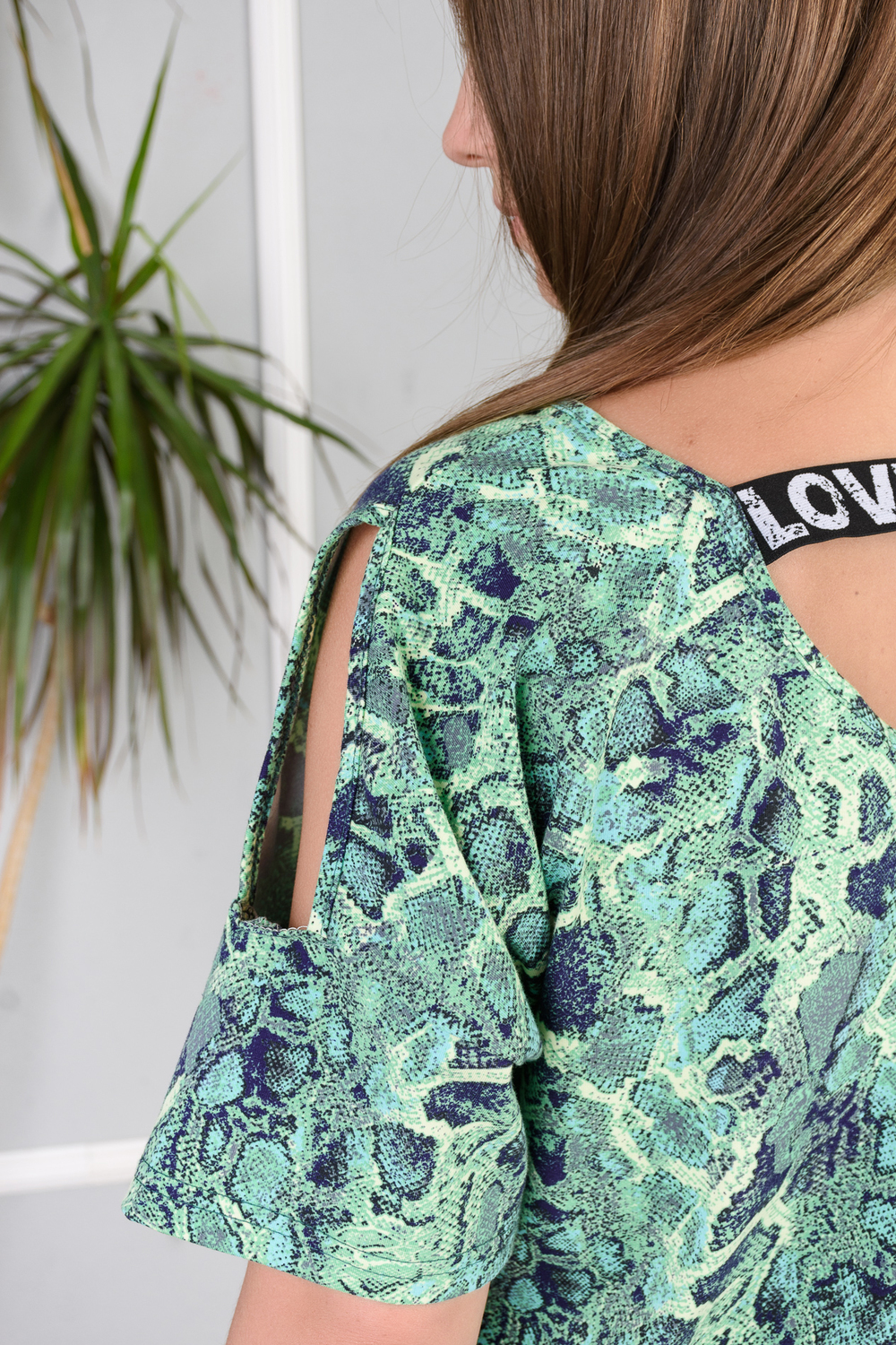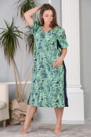 Платье прямое, длинное, с V-образной горловиной, с боковыми карманами. Рукав короткий. На плечах обработаны декоративные вырезы. Полочка с лампасами контрастного цвета вдоль боковых швов. В нижней части боковых швов обработаны разрезы. В верхней части спинки обработан фигурный вырез с резинкой. Горловина и вырезы на плечах обработаны бейкой из основного полотна.
