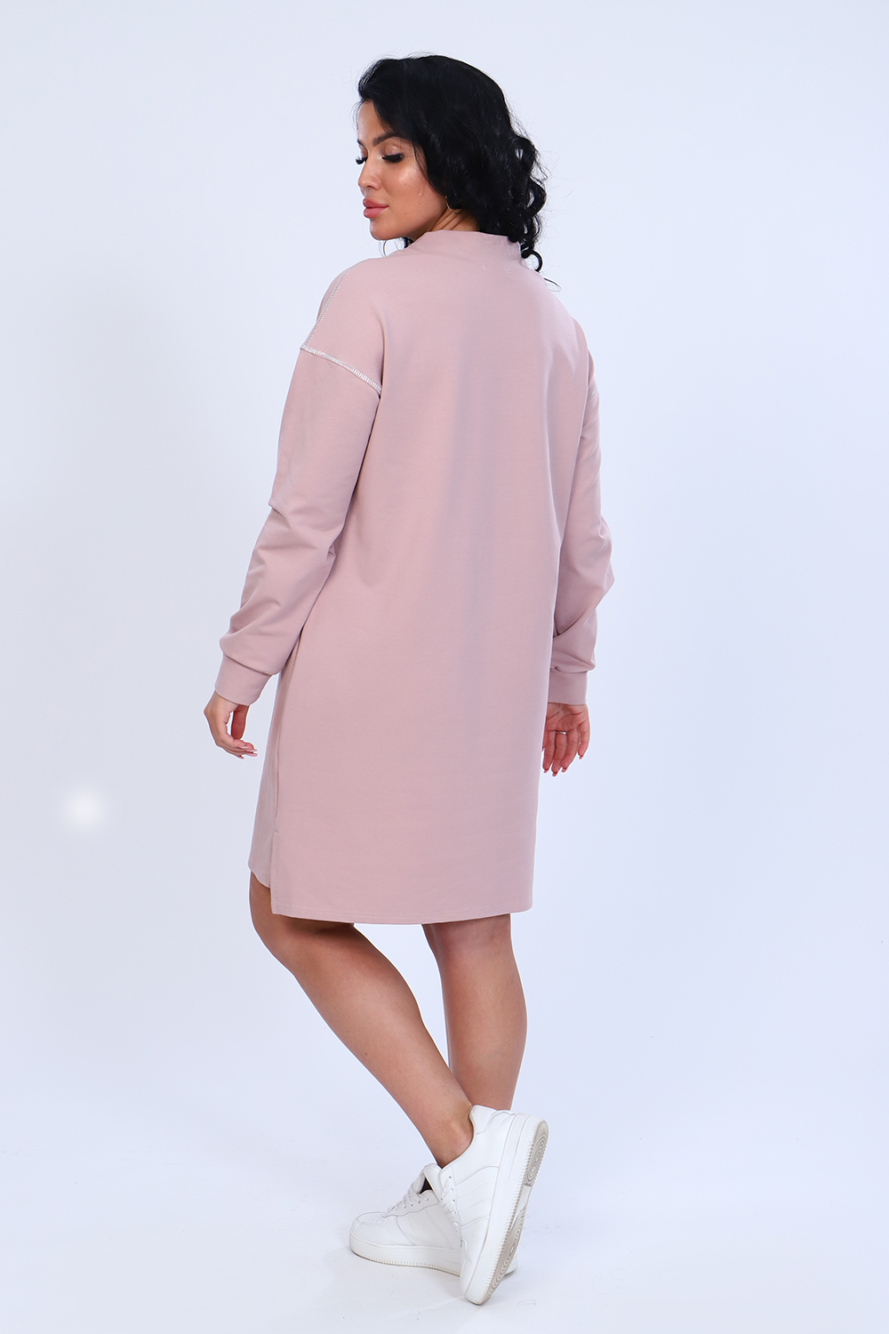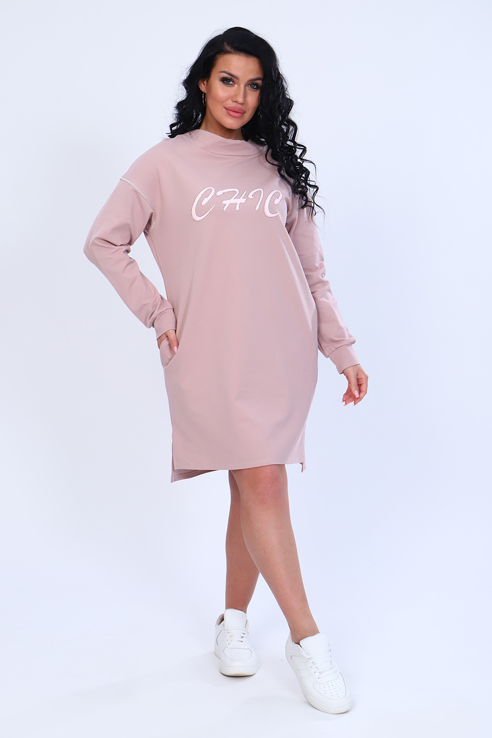Платье с оригинальным принтом из мягкого футера с лайкрой 2-х нитка. Модель свободного силуэта, горловина круглая, воротник-стойка, спущенная пройма, длинный рукав на манжете, в боковых швах удобные карманы, внизу по бокам разрезы, спинка чуть длиннее переда. По плечевому шву и по пройме рукава декоративная строчка из люрекса, гармонично сочетается с принтом на груди. Стильное, уютное платье отличный офисный вариант для современной, деловой модницы. Длина рукава в таблице измерений указана от начала горловины.