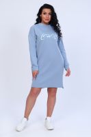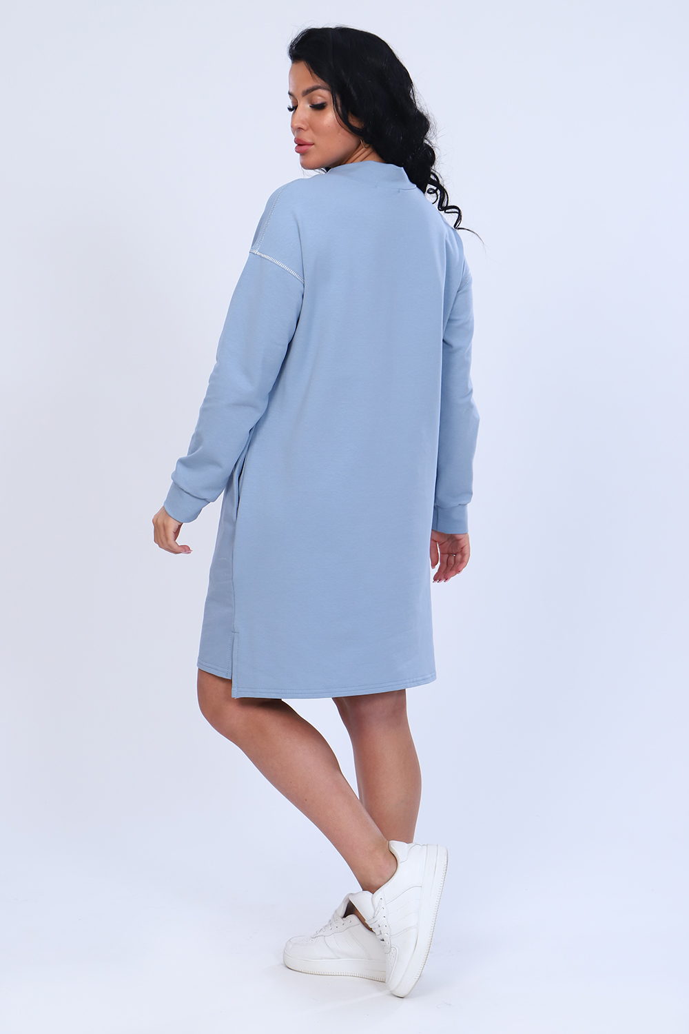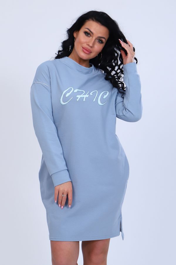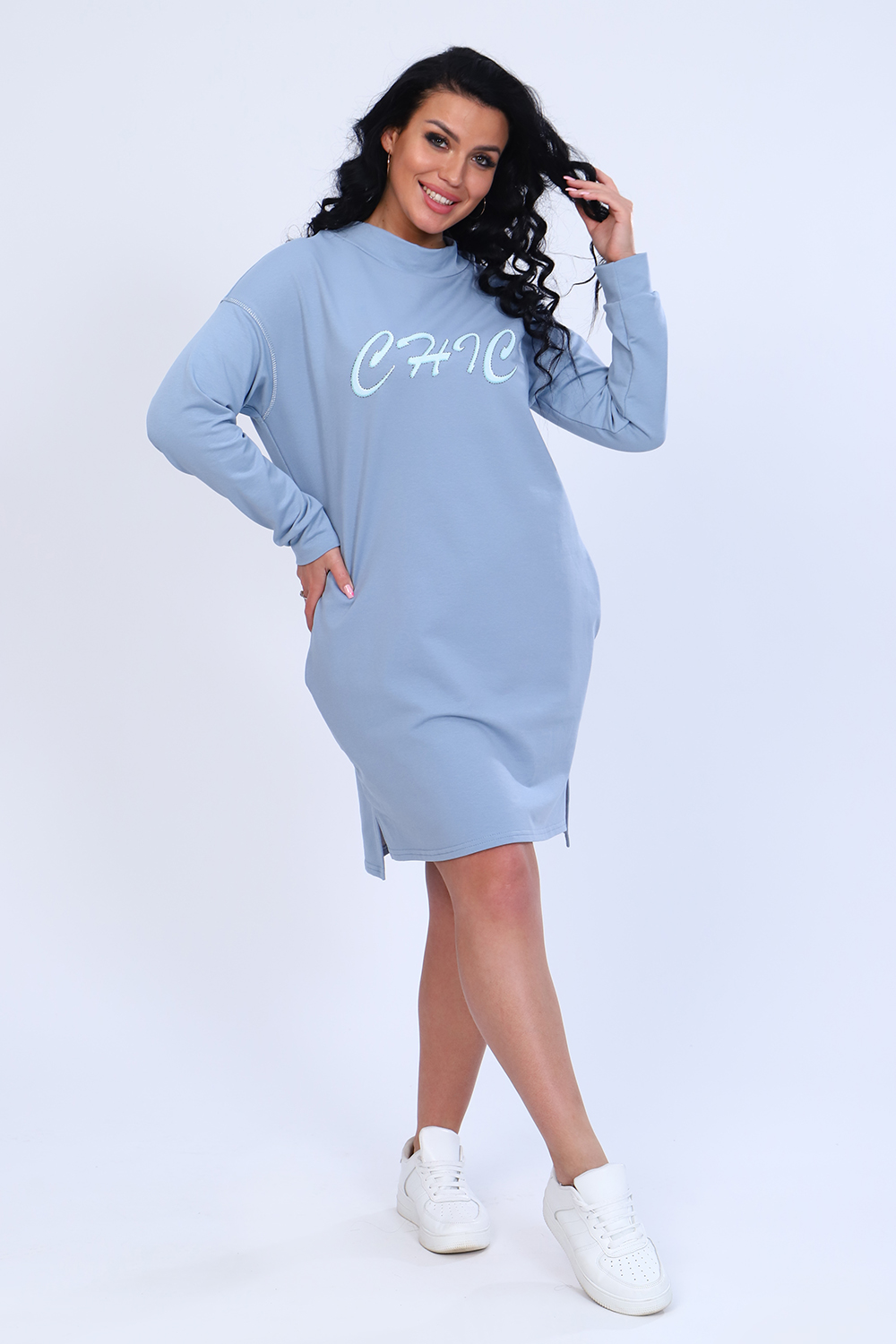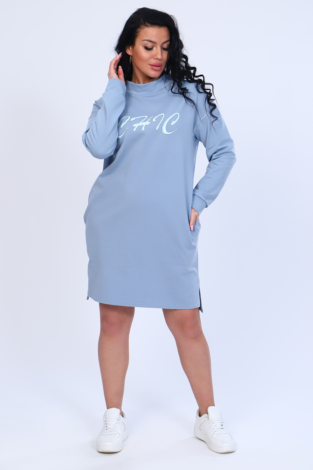 Платье с оригинальным принтом из мягкого футера с лайкрой 2-х нитка. Модель свободного силуэта, горловина круглая, воротник-стойка, спущенная пройма, длинный рукав на манжете, в боковых швах удобные карманы, внизу по бокам разрезы, спинка чуть длиннее переда. По плечевому шву и по пройме рукава декоративная строчка из люрекса, гармонично сочетается с принтом на груди. Стильное, уютное платье отличный офисный вариант для современной, деловой модницы. Длина рукава в таблице измерений указана от начала горловины.