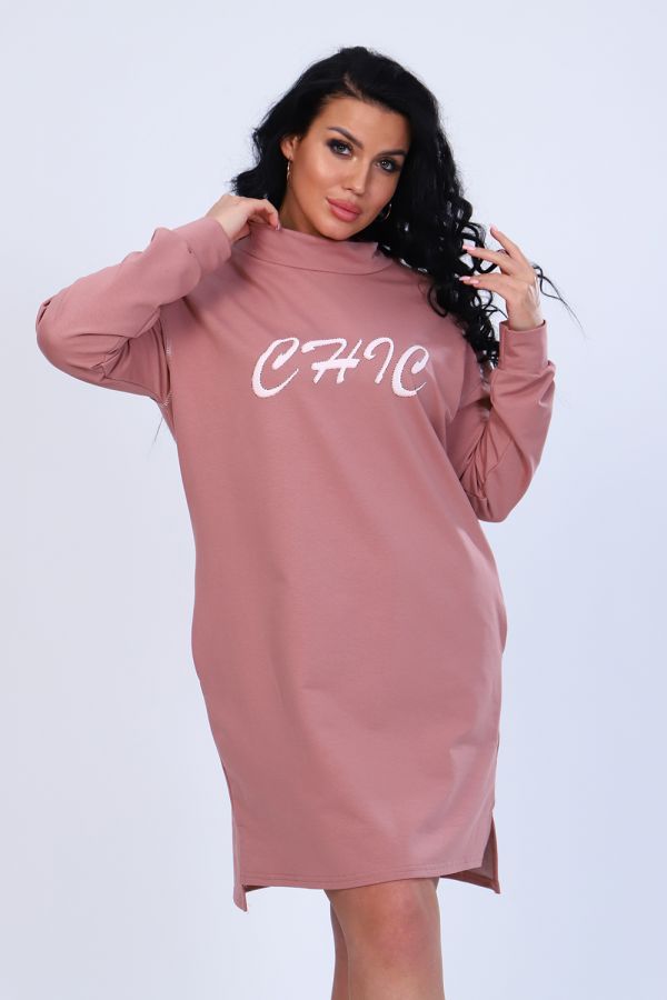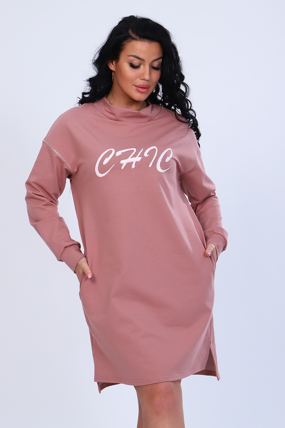 Платье с оригинальным принтом из мягкого футера с лайкрой 2-х нитка. Модель свободного силуэта, горловина круглая, воротник-стойка, спущенная пройма, длинный рукав на манжете, в боковых швах удобные карманы, внизу по бокам разрезы, спинка чуть длиннее переда. По плечевому шву и по пройме рукава декоративная строчка из люрекса, гармонично сочетается с принтом на груди. Стильное, уютное платье отличный офисный вариант для современной, деловой модницы. Длина рукава в таблице измерений указана от начала горловины.