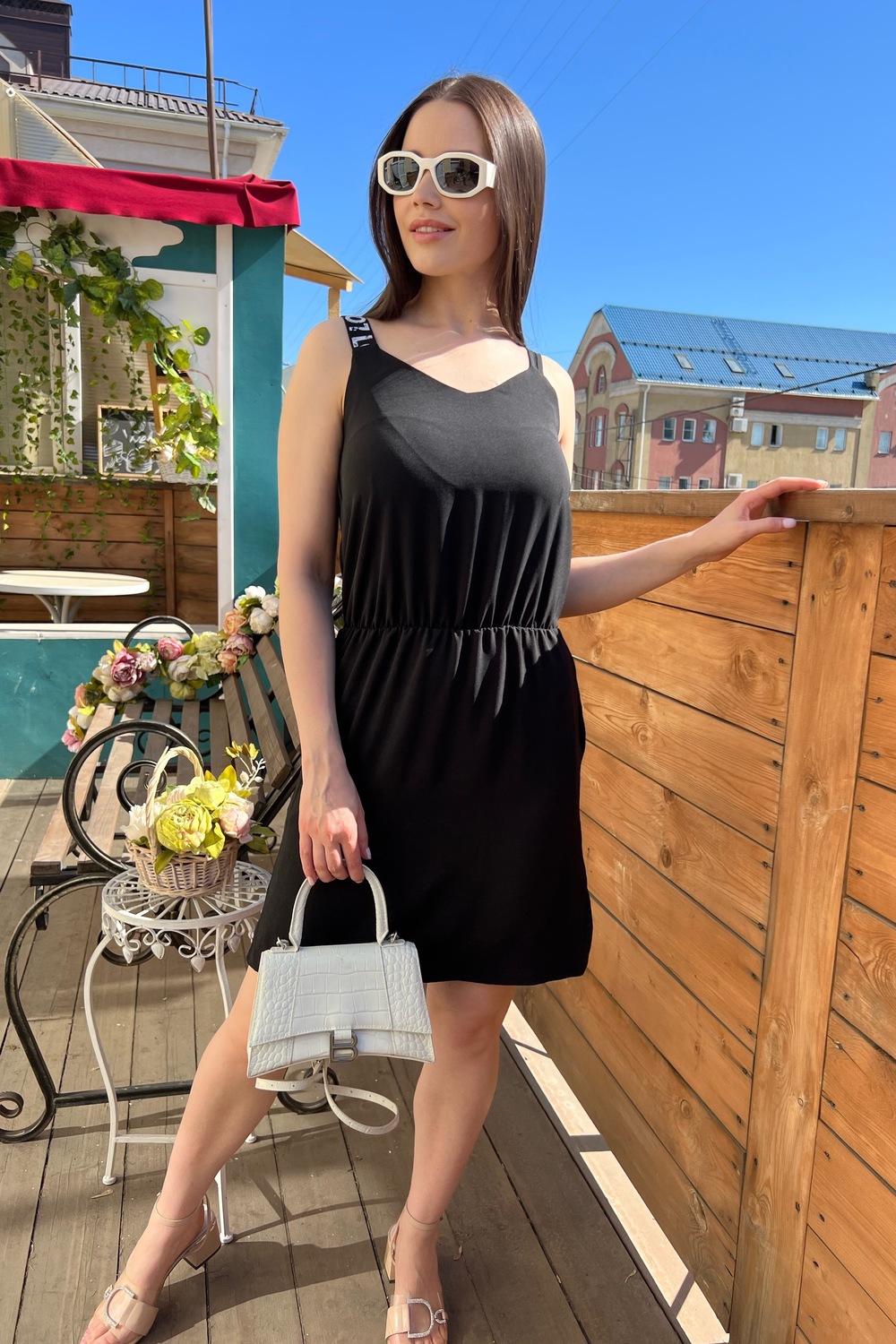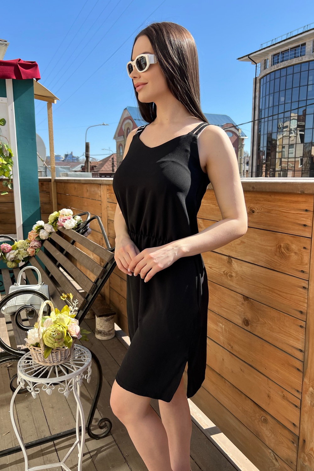 Сарафан прямой, длинной выше колена, с V-образной горловиной на полочке и спинке, с боковыми карманами, по линии талии собран на резинку. В нижней части боковых швов обработаны разрезы. Ткань из синтетических волокон может при носке вызывать статическое напряжение. Его можно легко снять стиркой с кондиционером или другими антистатическими средствами.