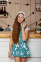 Платье длинной выше колена, с оборкой по низу, с капюшоном из сетки. Рукав короткий из сетки, с фигурным вырезом. Лицевой край капюшона, фигурные вырезы рукавов обработаны бейкой из основного полотна.