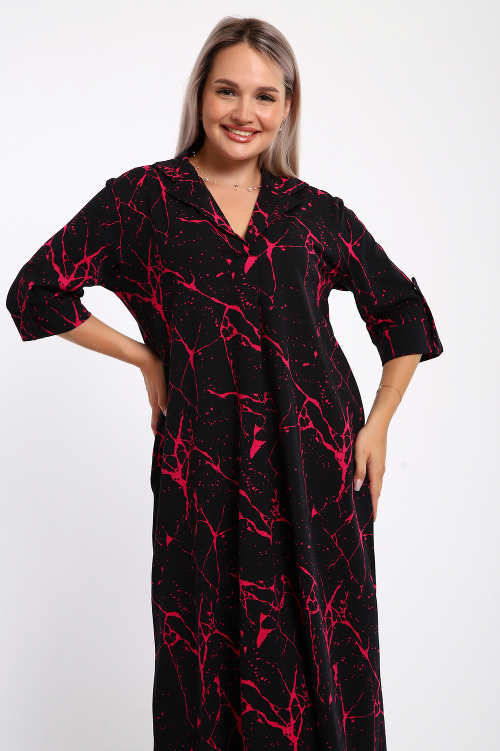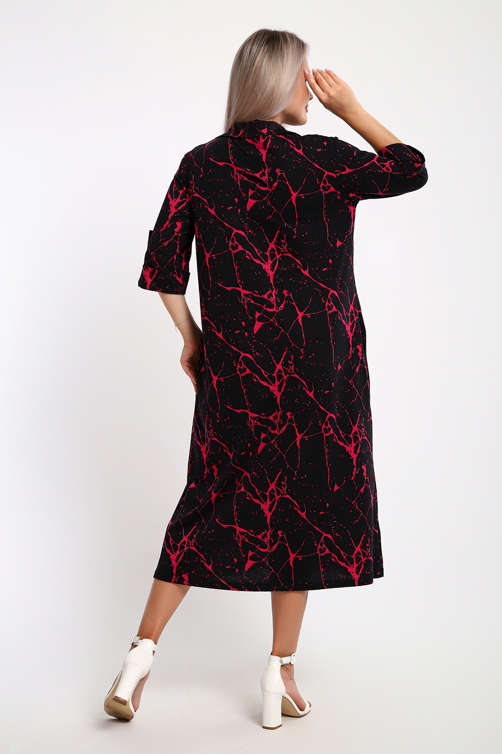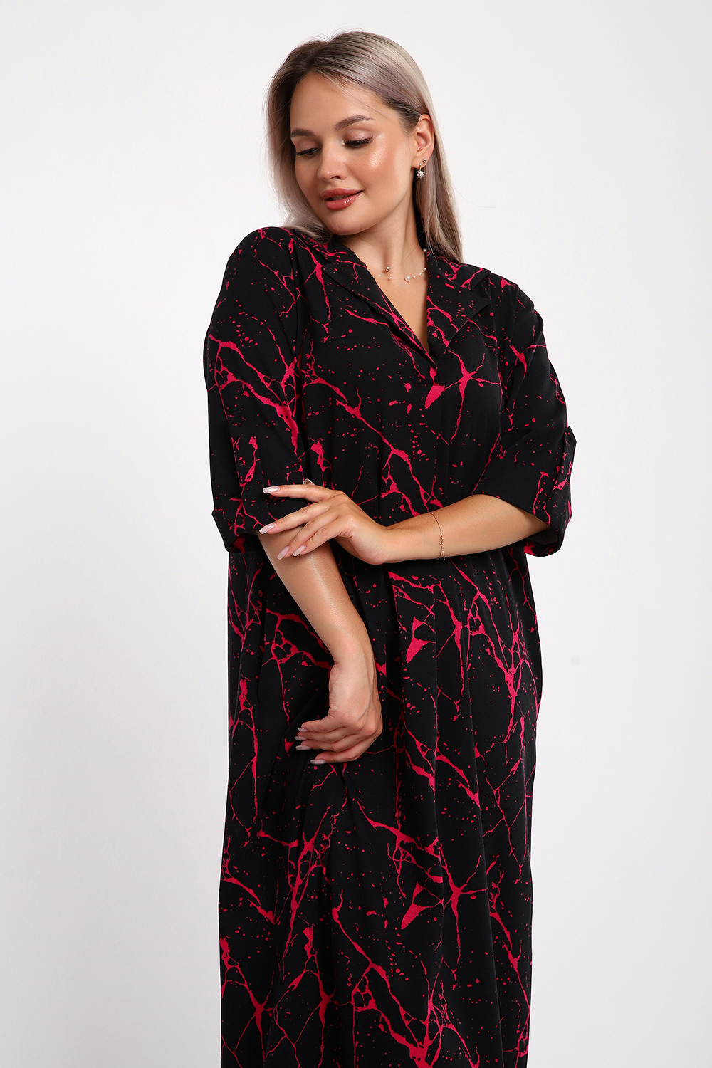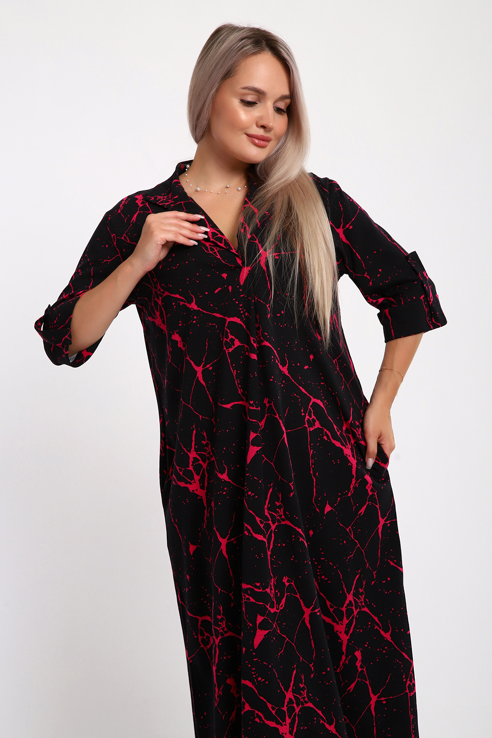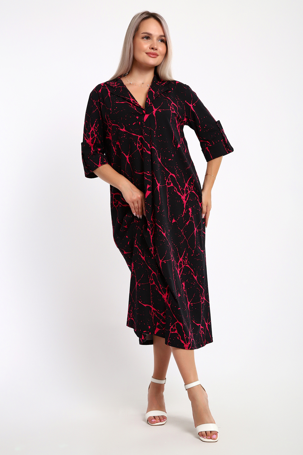 Платье женское свободного покроя. Воротник отложной рубашечного типа, образует V-образный вырез. Платье с карманами в боковых швах. Длина платья чуть выше щиколотки. Рукав 3/4 с манжетой, поднят патой. На моделе представлен 48 размер. Параметры модели: 97-71-101, рост 165 см.