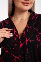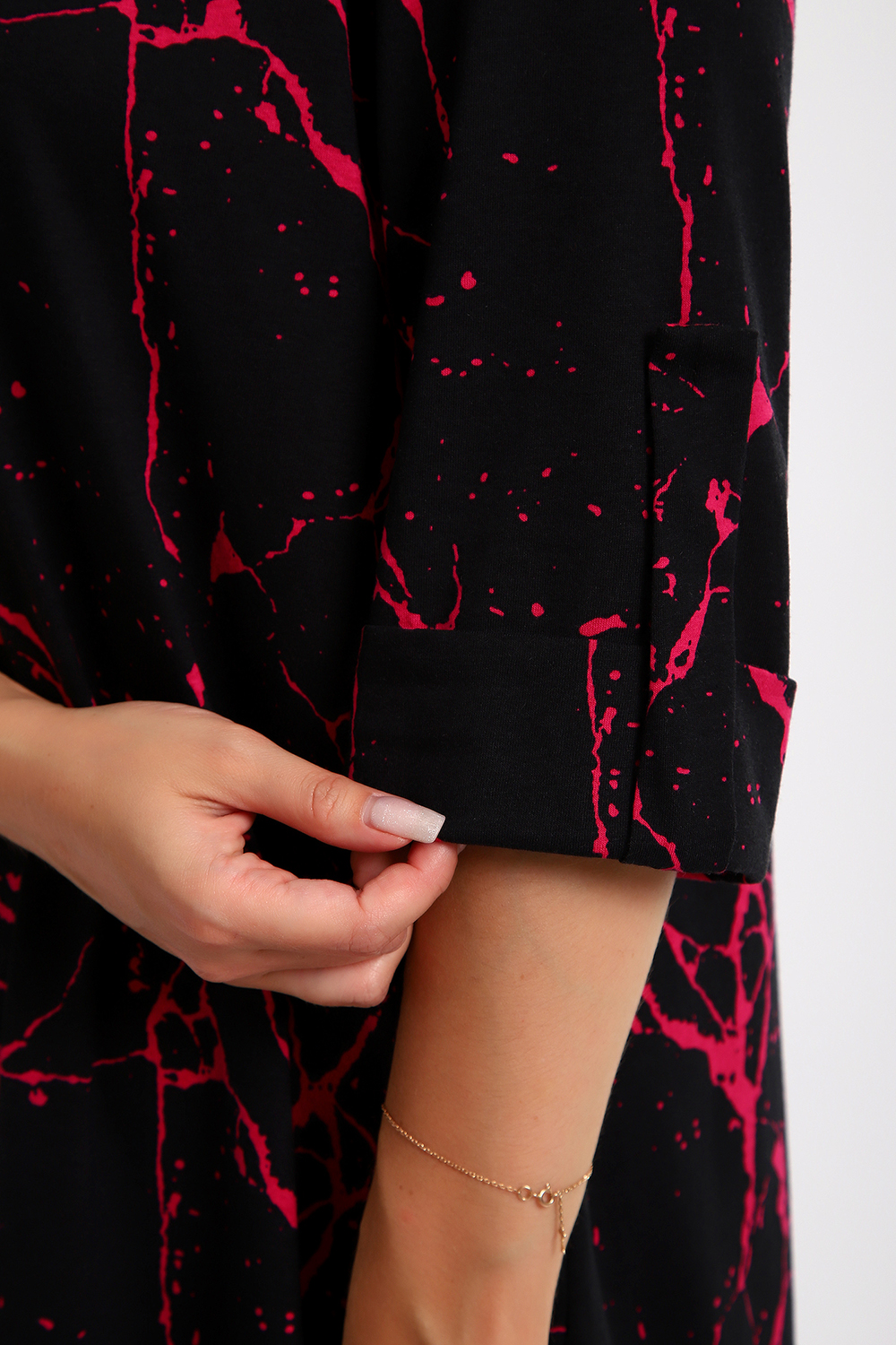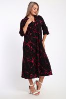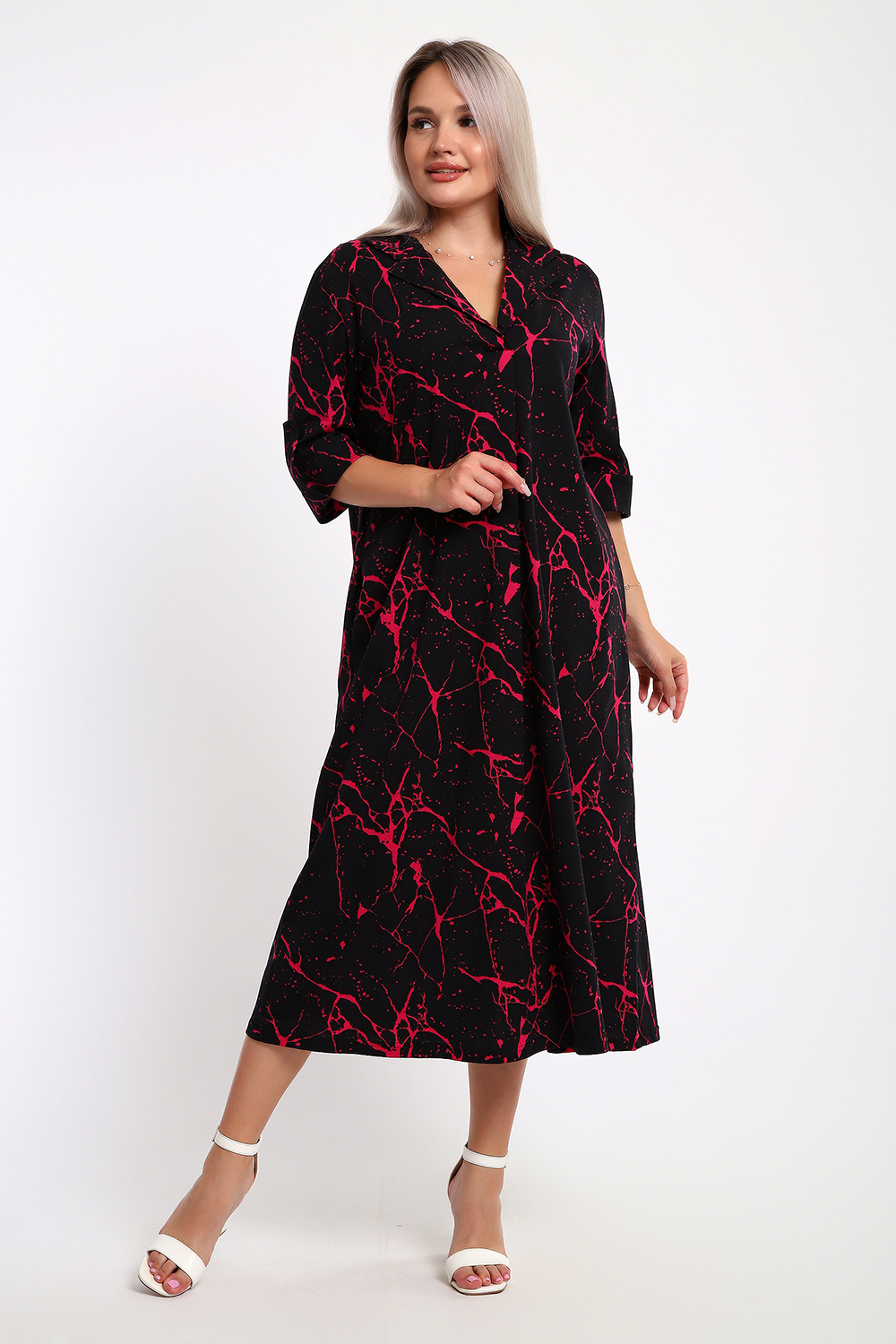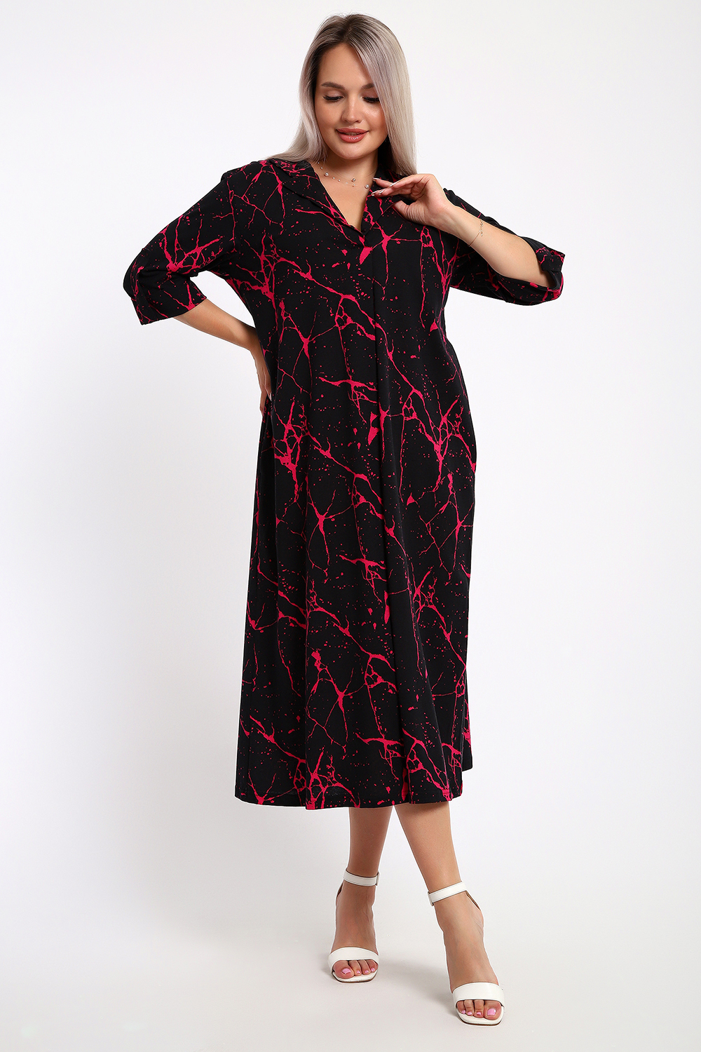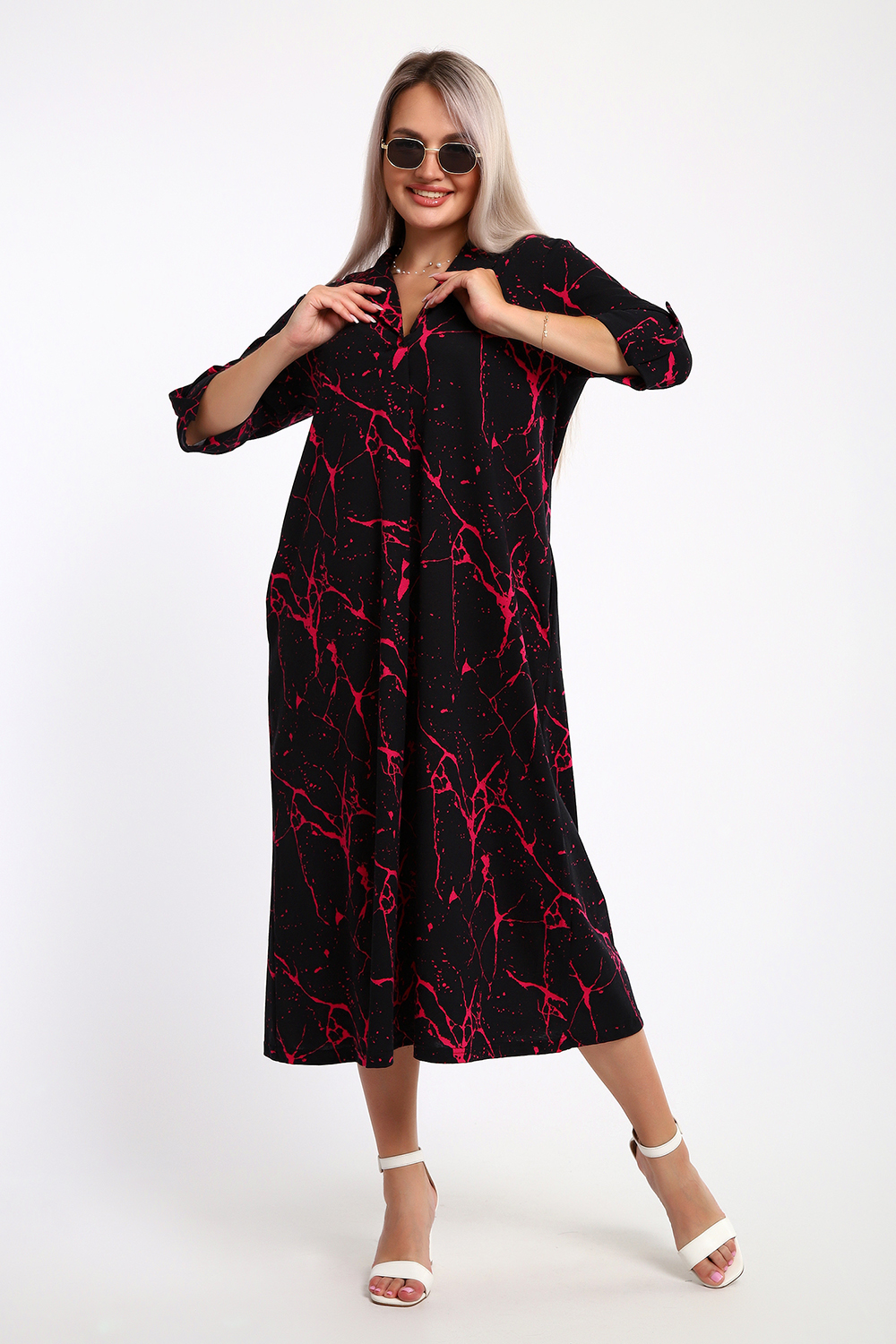Платье женское свободного покроя. Воротник отложной рубашечного типа, образует V-образный вырез. Платье с карманами в боковых швах. Длина платья чуть выше щиколотки. Рукав 3/4 с манжетой, поднят патой. На моделе представлен 48 размер. Параметры модели: 97-71-101, рост 165 см.