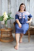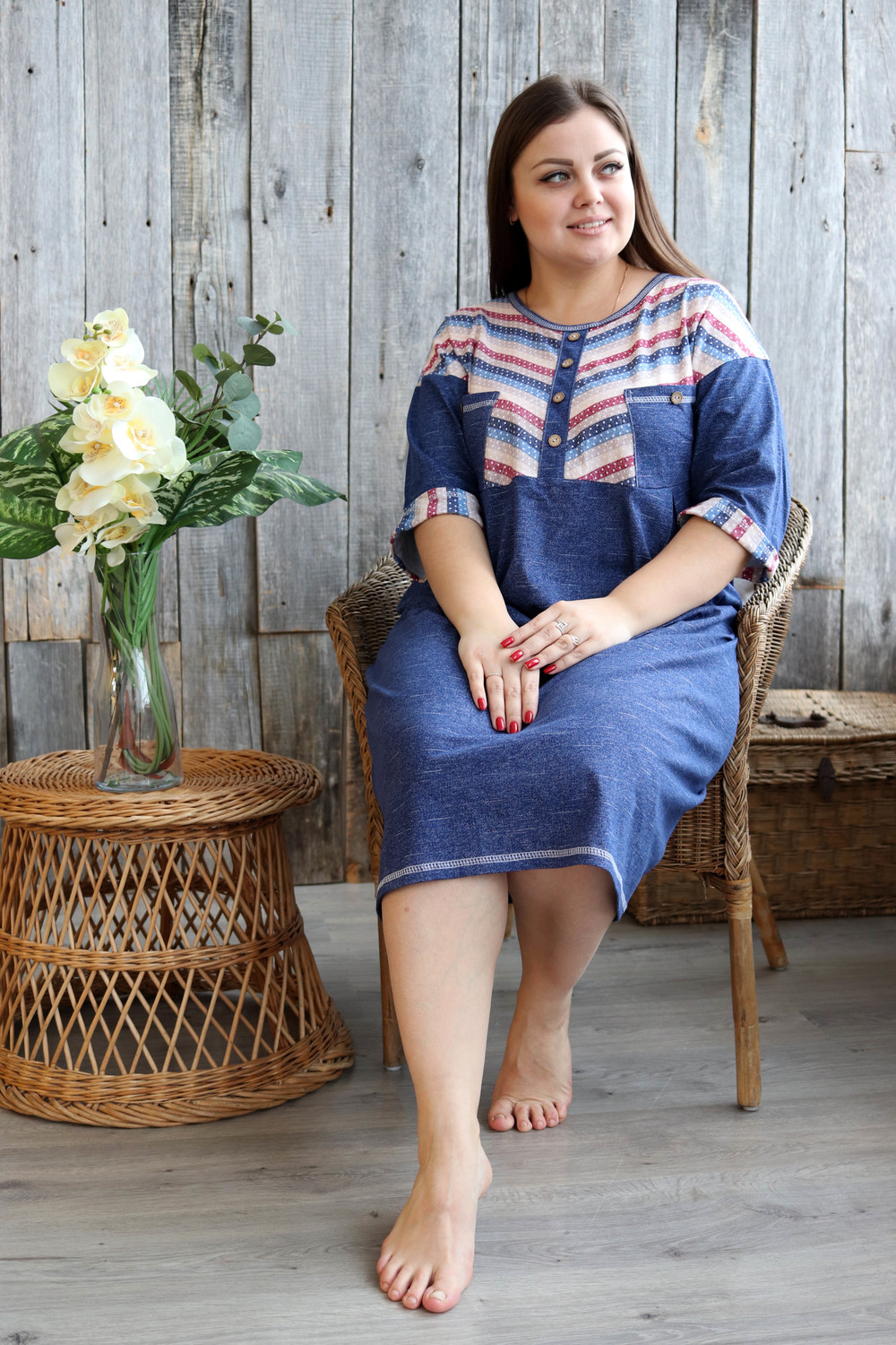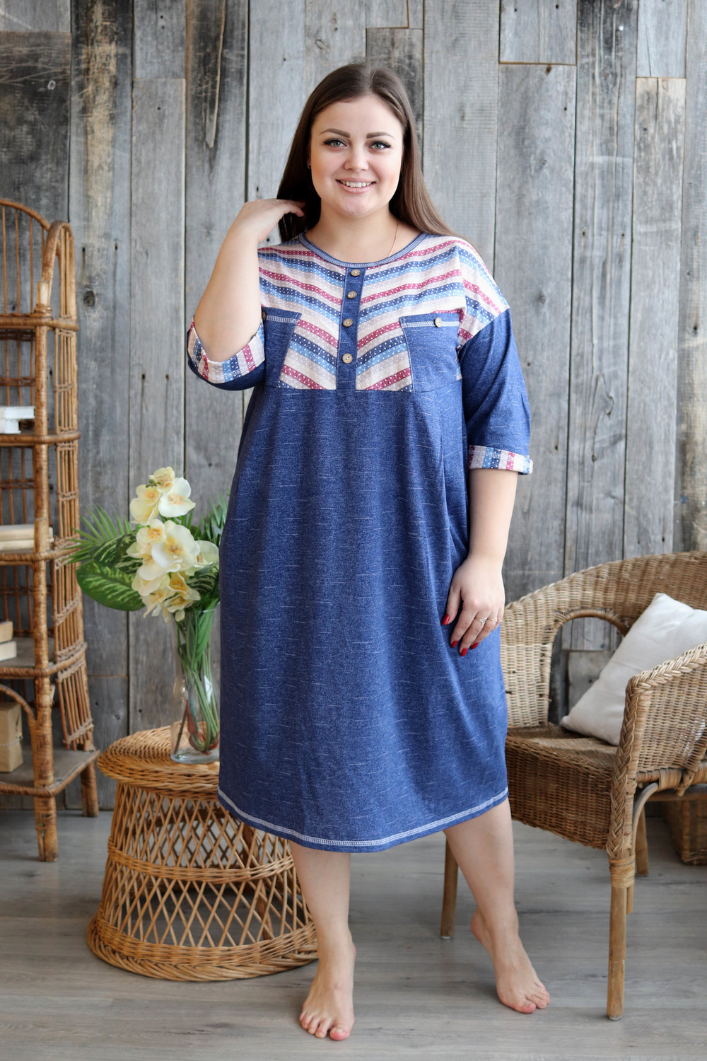 Платье женское прямого силуэта. Рукав цельнокроенный со швом. Верхняя часть полочки и манжета рукава из отделочной ткани в полоску. В верхней части полочки накладные карманы и имитация планки, в нижней: встречные складки, обеспечивающие дополнительную свободу в области талии и бедер. На модели 52 размер