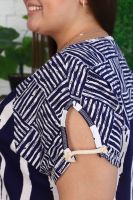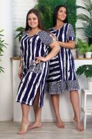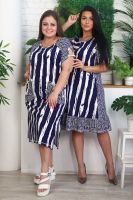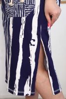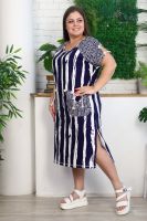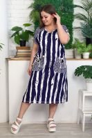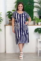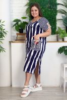 Платье женское полуприлегающего силуэта. Рукав цельнокроенный, спереди имитация реглана, сзади на спинке кокетка. На полочке накладные фигурные карманы, по боковым швам разрезы. Платье в морском стиле, этот образ подчеркнут благодаря использованию х/б шнура в кармане и рукаве, а также ткани в полоску с замечательным компаньоном клетка. На модели 52 размер. На фото платье из той же коллекции 9121