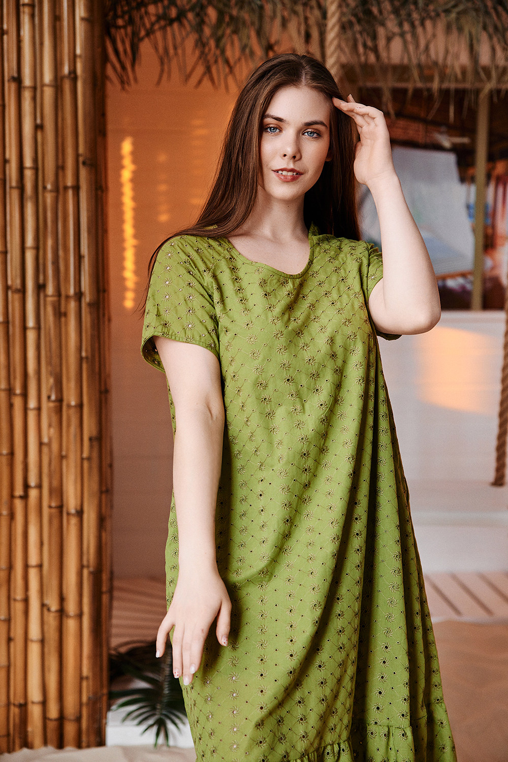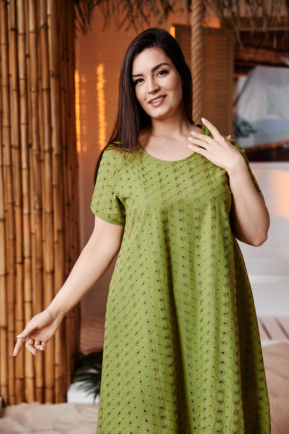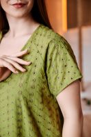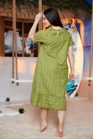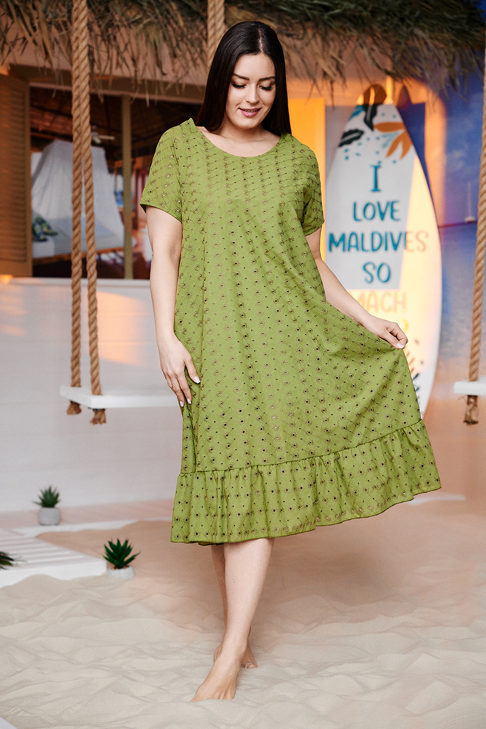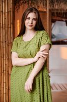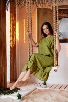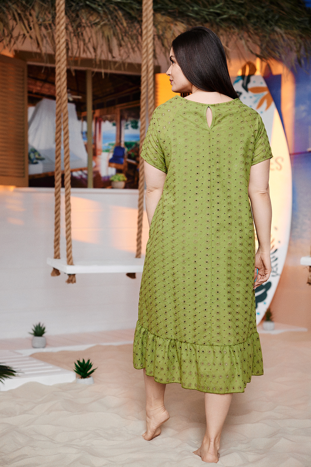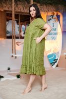 Платье женское, свободное, расширенное к низу, на подкладке. Рукав реглан, короткий. Горловина округлая, внизу платья широкая рюша, в боковых швах внутренние карманы.