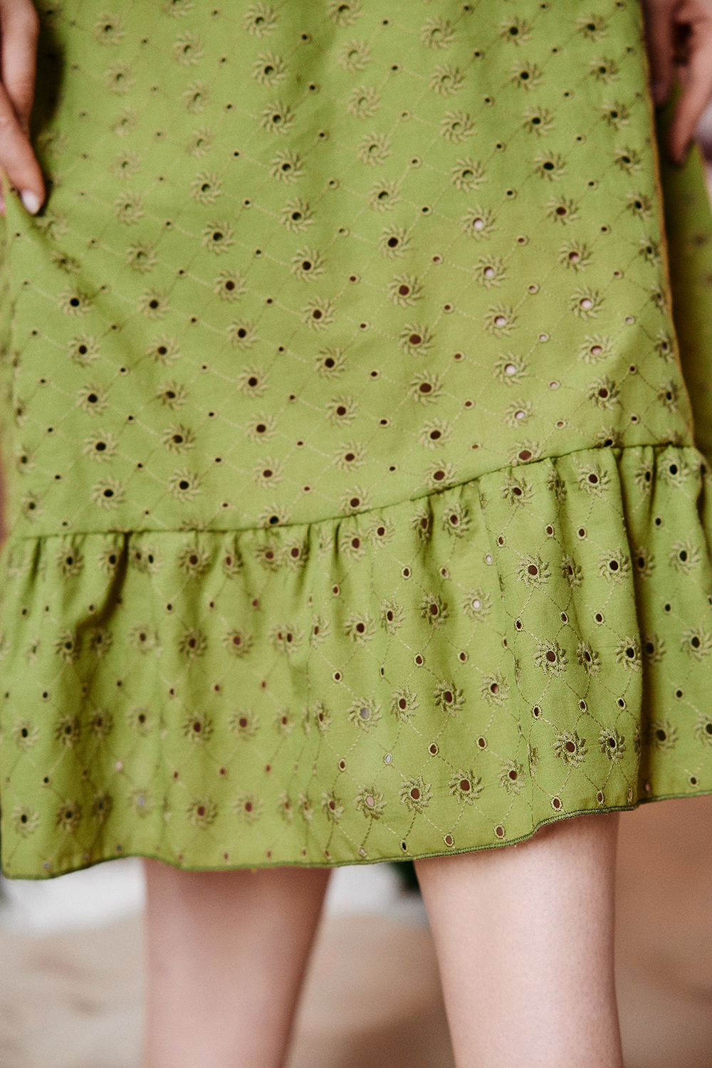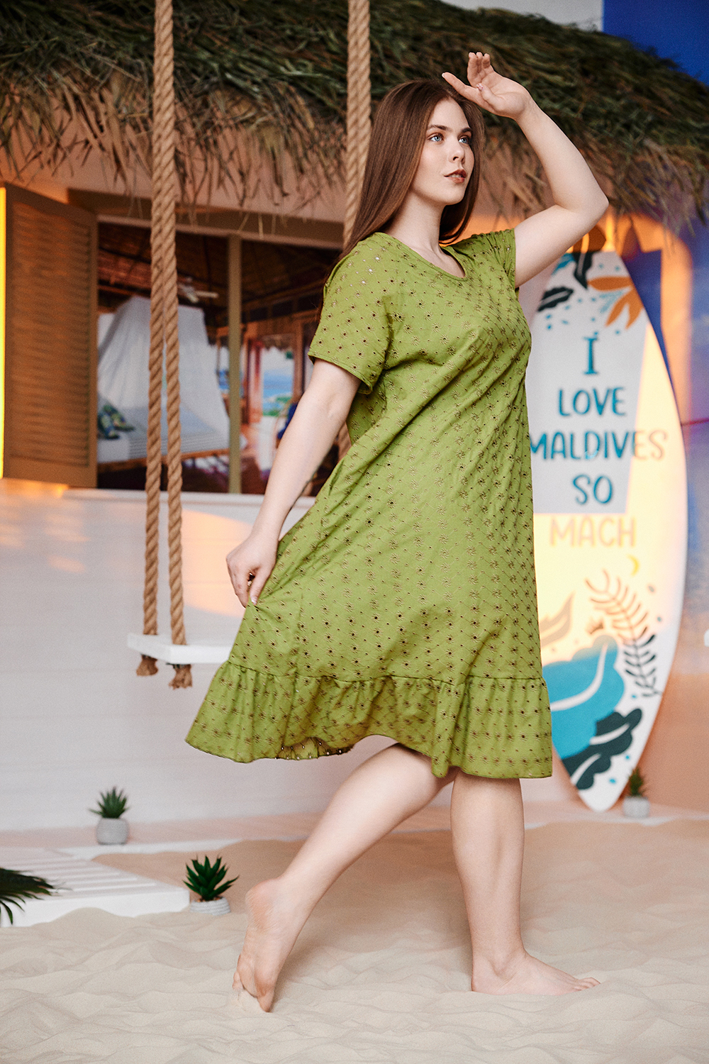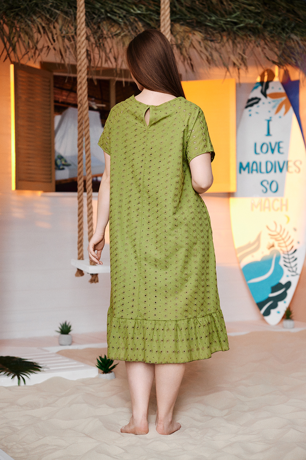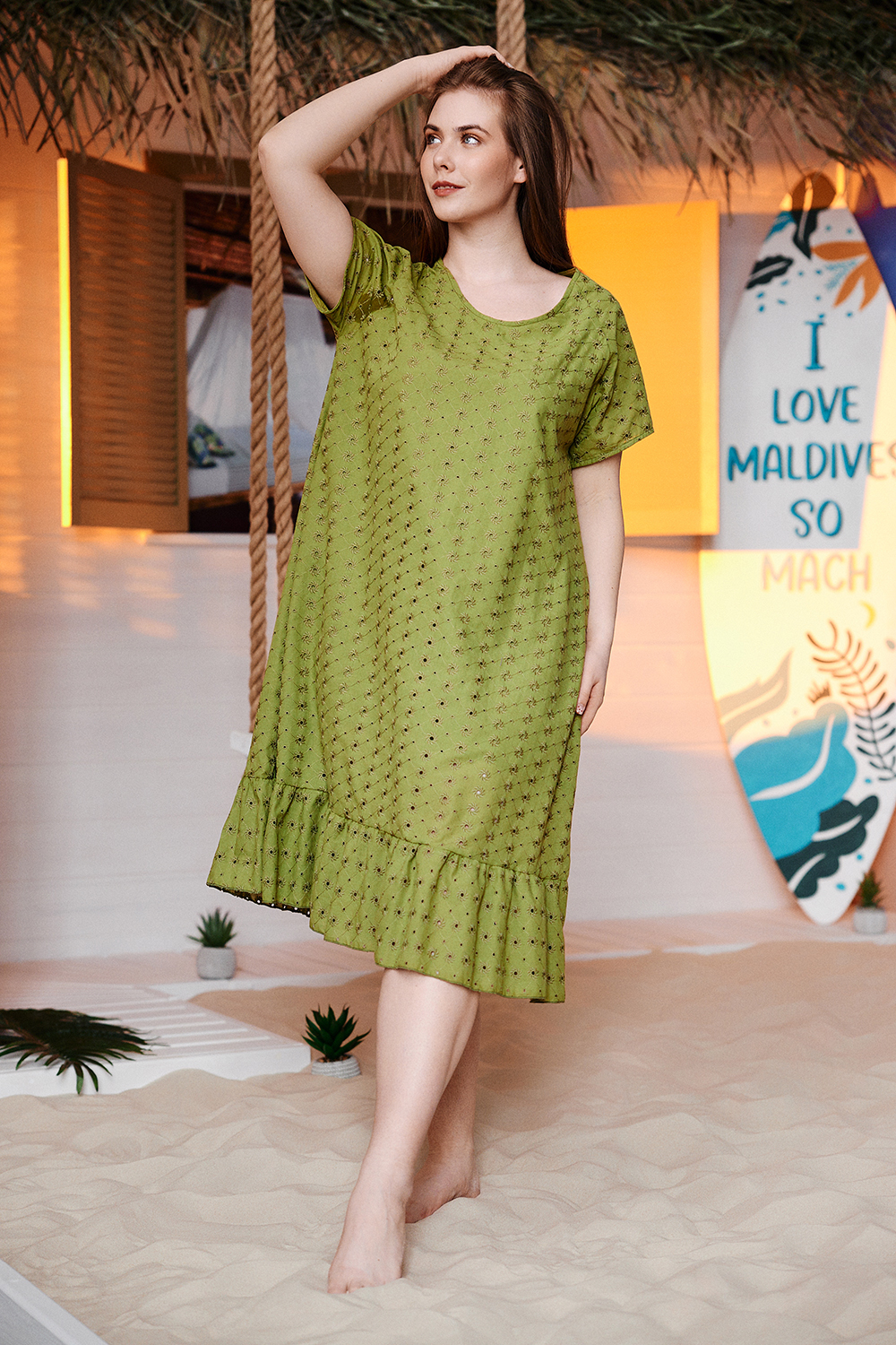 Платье женское, свободное, расширенное к низу, на подкладке. Рукав реглан, короткий. Горловина округлая, внизу платья широкая рюша, в боковых швах внутренние карманы.