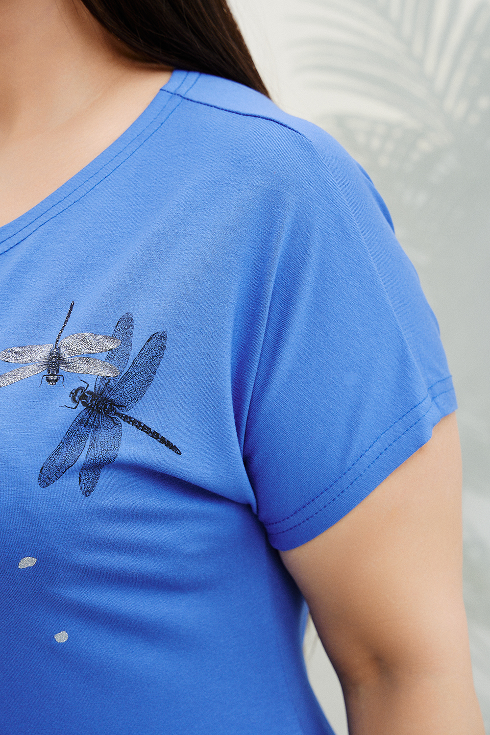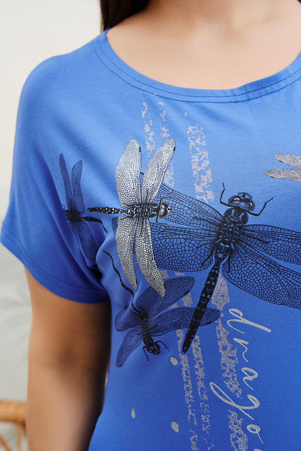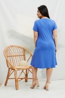 Платье женское полуприлегающего силуэта, слегка расширенное к низу. Рукав цельнокроенный короткий. Горловина округлая. В боковом шве внутренние карманы. На полочке крупный стильный принт.