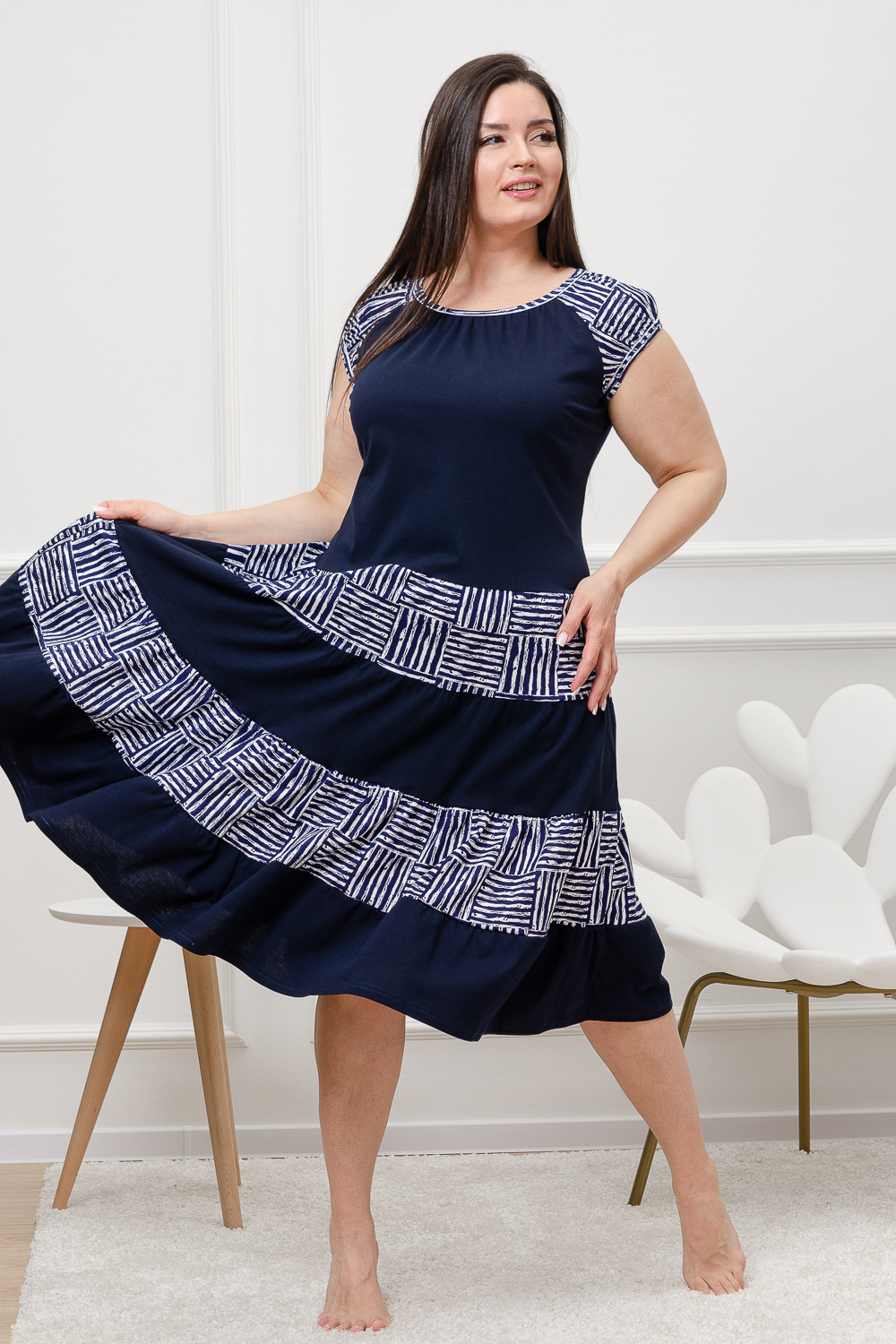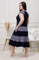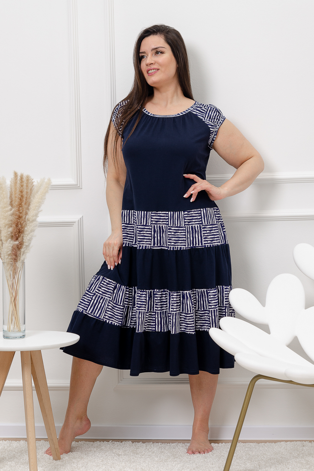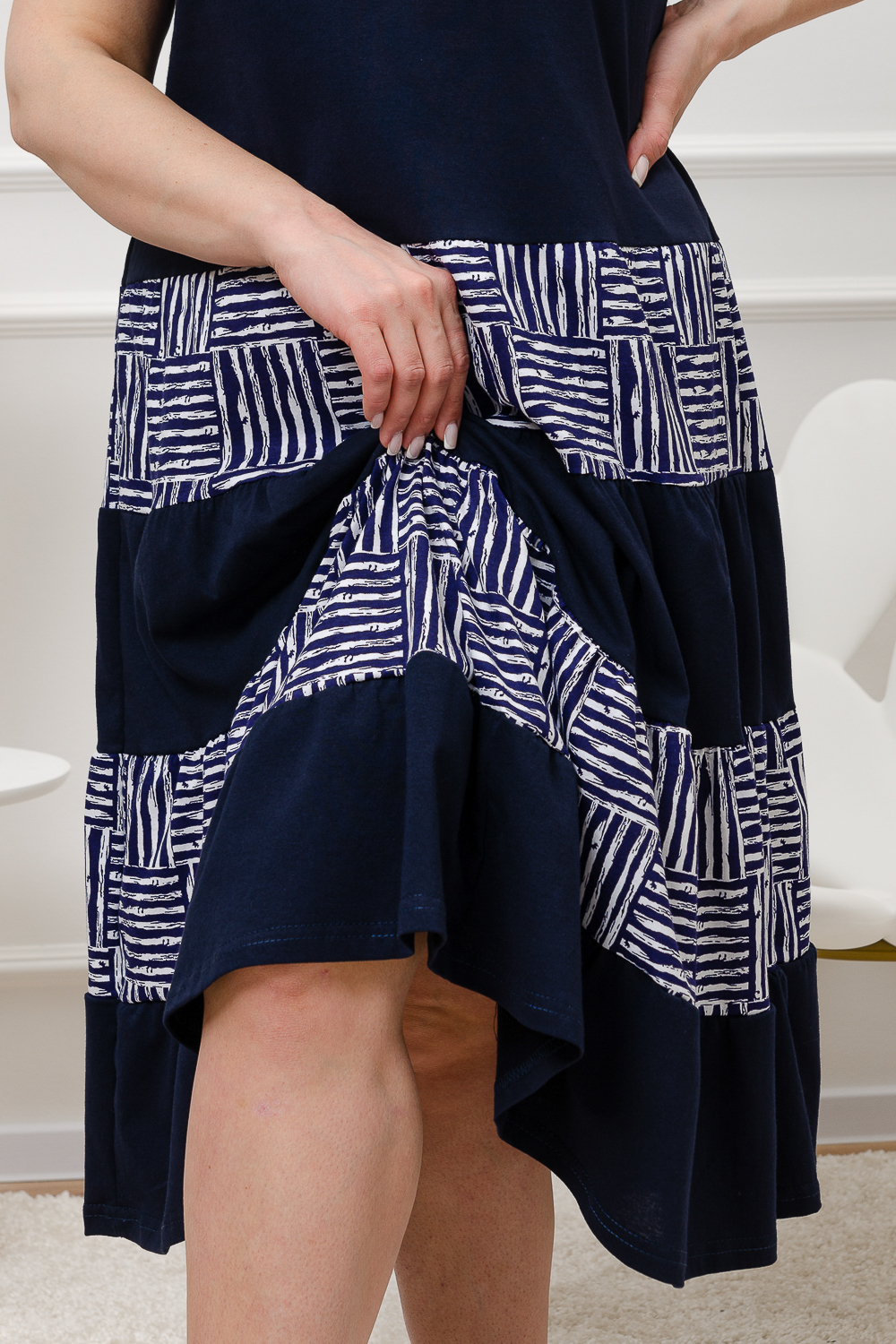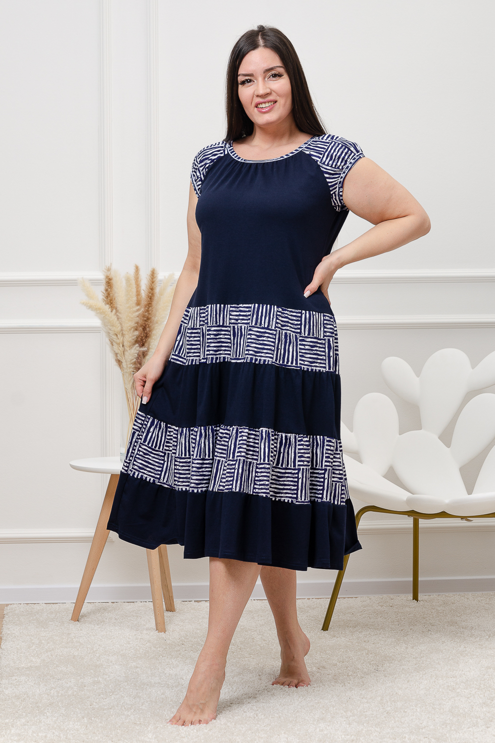 Платье женское полуприлегающего силуэта. Рукав реглан короткий. Сборка по горловине и рукаву. Низ платья из четырех ярусов тканей - компаньонов. Сочетание ткани" в полоску" с тканью "под джинс" делает это платье еще более актуальным.