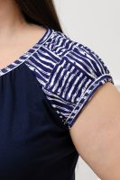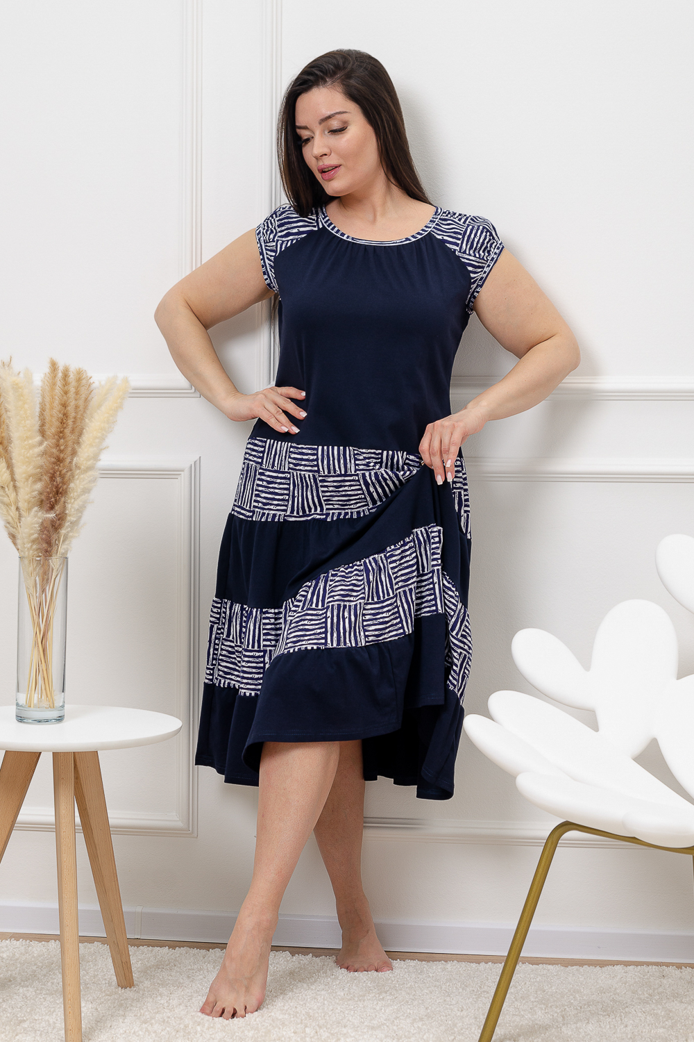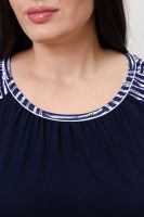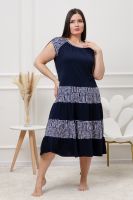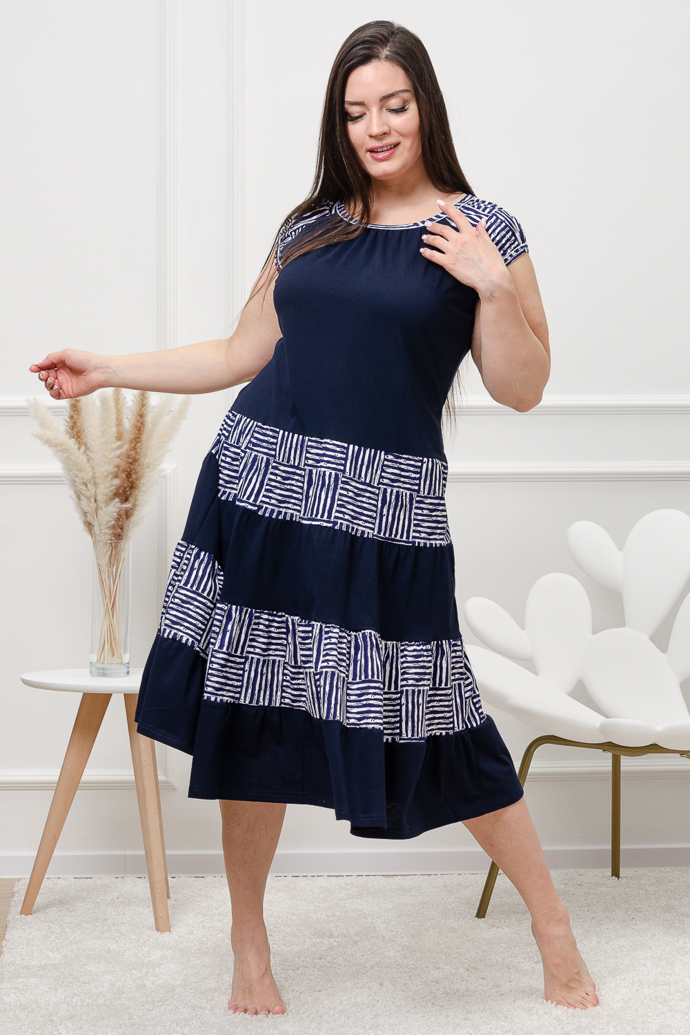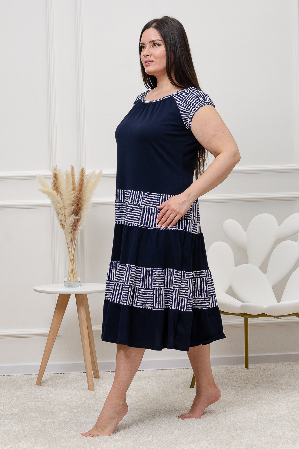 Платье женское полуприлегающего силуэта. Рукав реглан короткий. Сборка по горловине и рукаву. Низ платья из четырех ярусов тканей - компаньонов. Сочетание ткани" в полоску" с тканью "под джинс" делает это платье еще более актуальным.