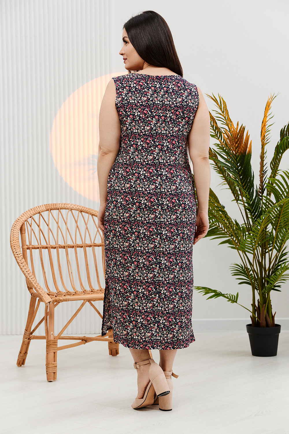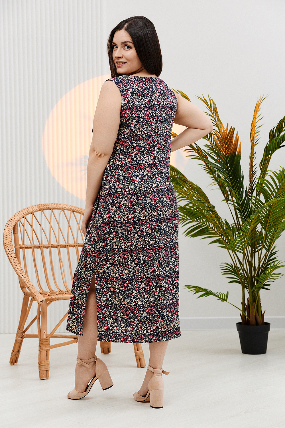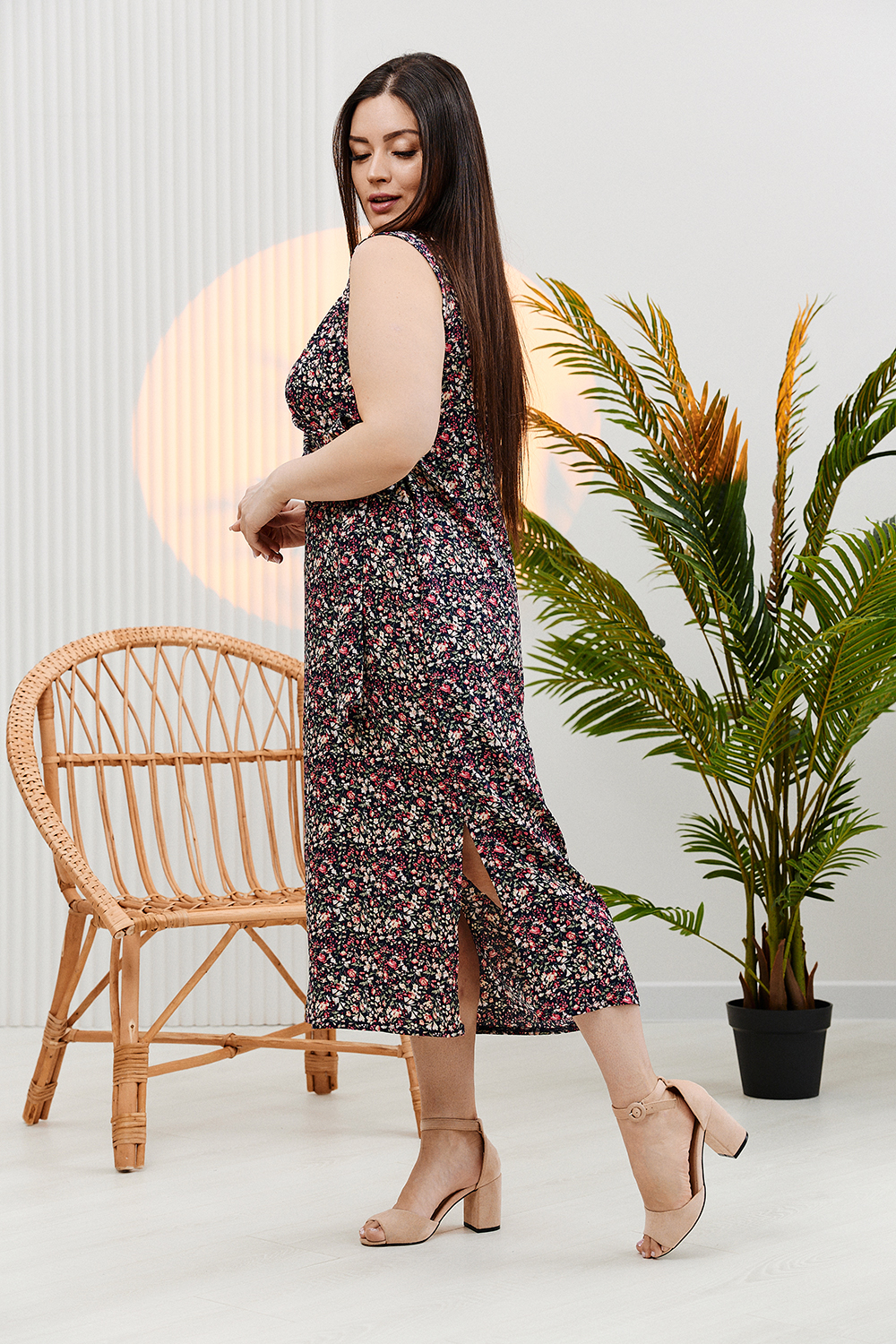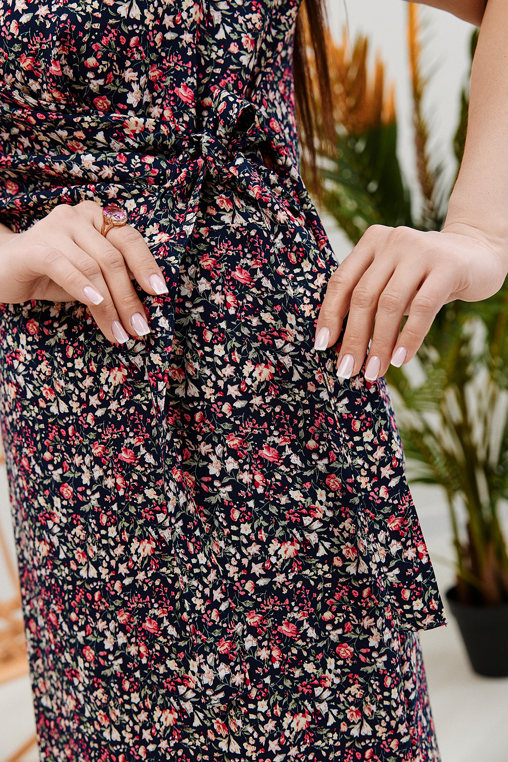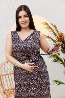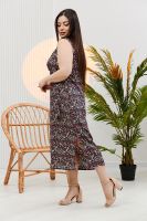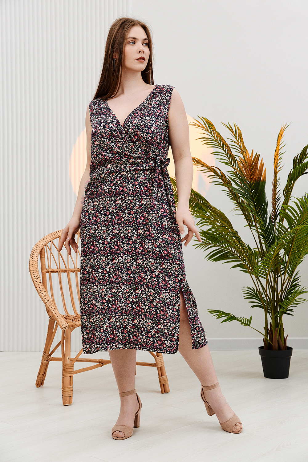 Платье женское полуприлегающего силуэта. Верхняя правая часть полочки со складками запахивается на левую. Прилегание по талии регулируется завязками. От линии бедер платье прямое с боковыми разрезами. В лекалах учтена незначительная усадка ткани после стирки.