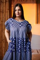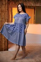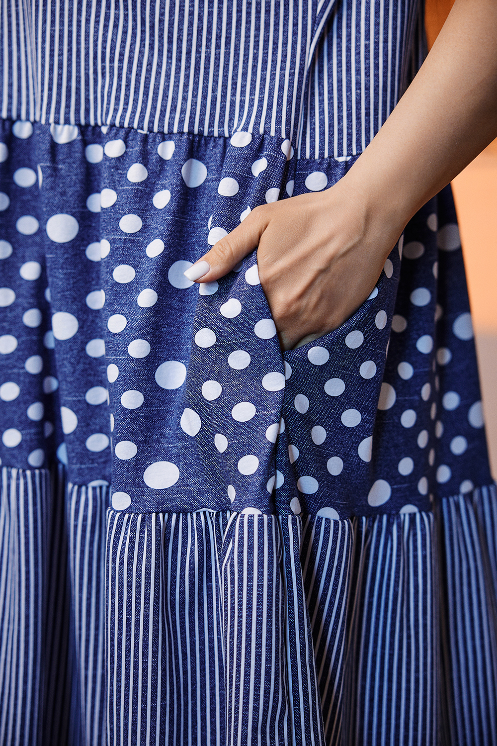 Платье женское, свободное, к низу расширенное за счет сборки каждого из трех ярусов. Рукав цельнокроеный короткий, внизу рукава рюша. Вырез горловины округлый. Эта модель платья очень комфортна для любого типа женской фигуры, а сочетание ткани в горошек и полоску придает изделию особую привлекательность.