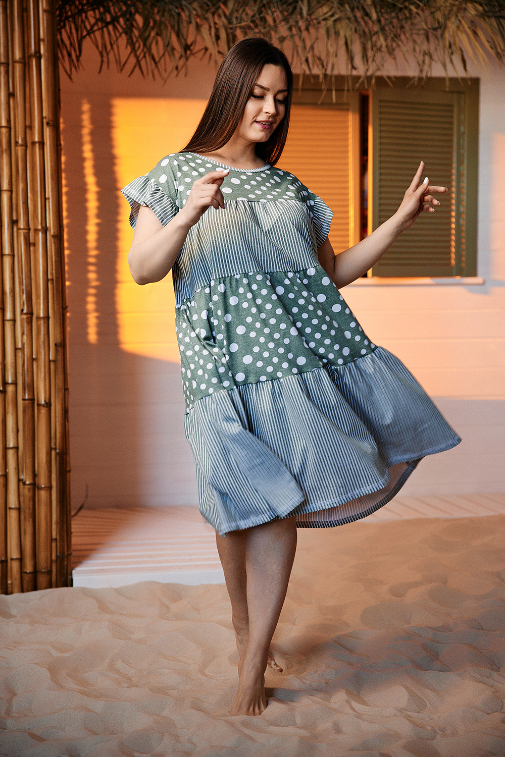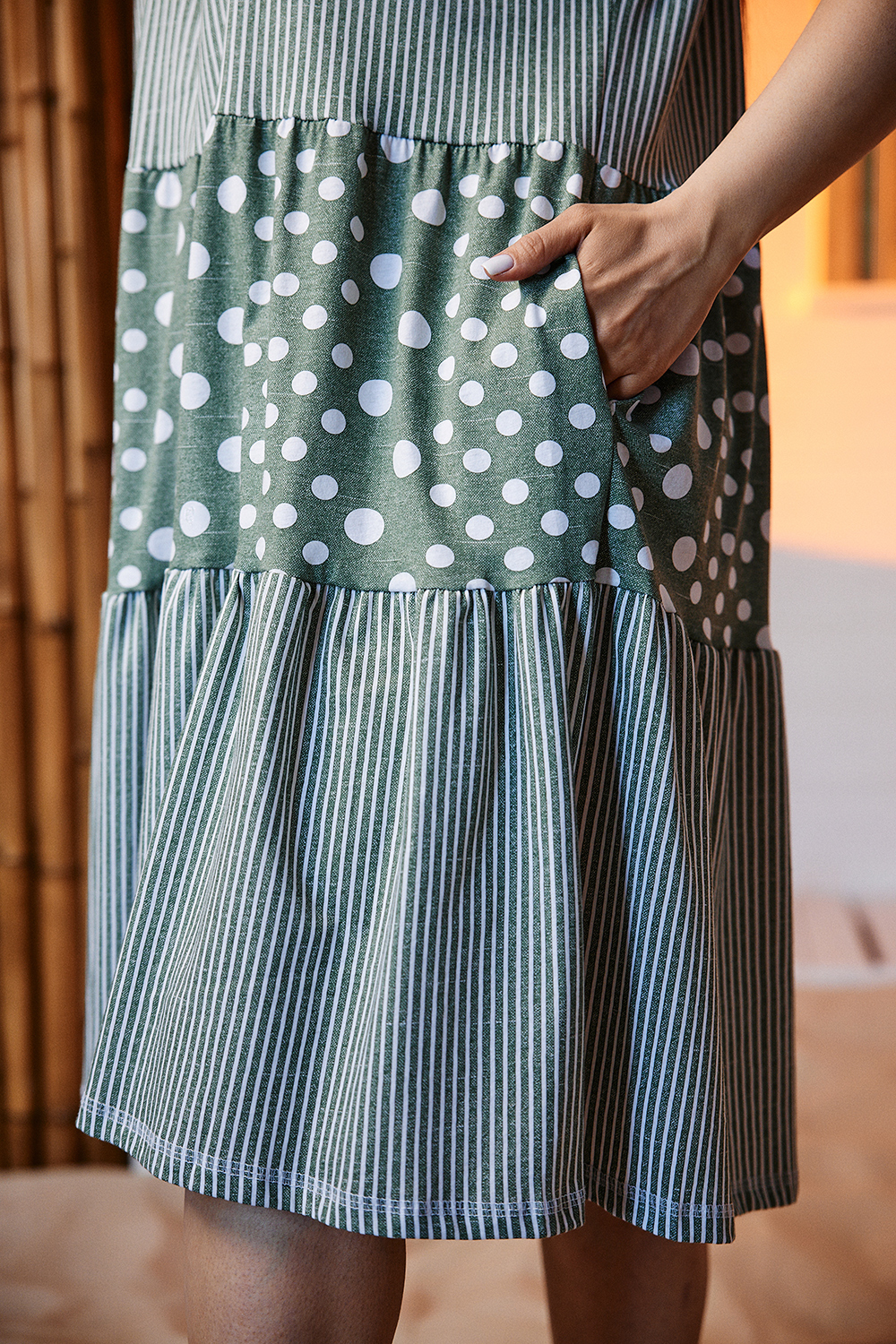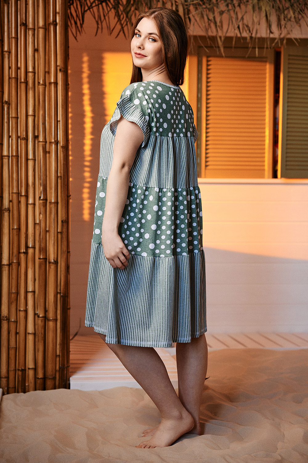 Платье женское, свободное, к низу расширенное за счет сборки каждого из трех ярусов. Рукав цельнокроеный короткий, внизу рукава рюша. Вырез горловины округлый. Эта модель платья очень комфортна для любого типа женской фигуры, а сочетание ткани в горошек и полоску придает изделию особую привлекательность.