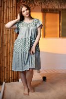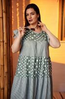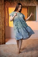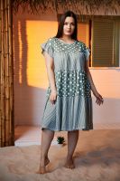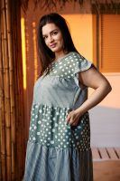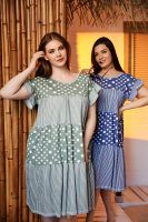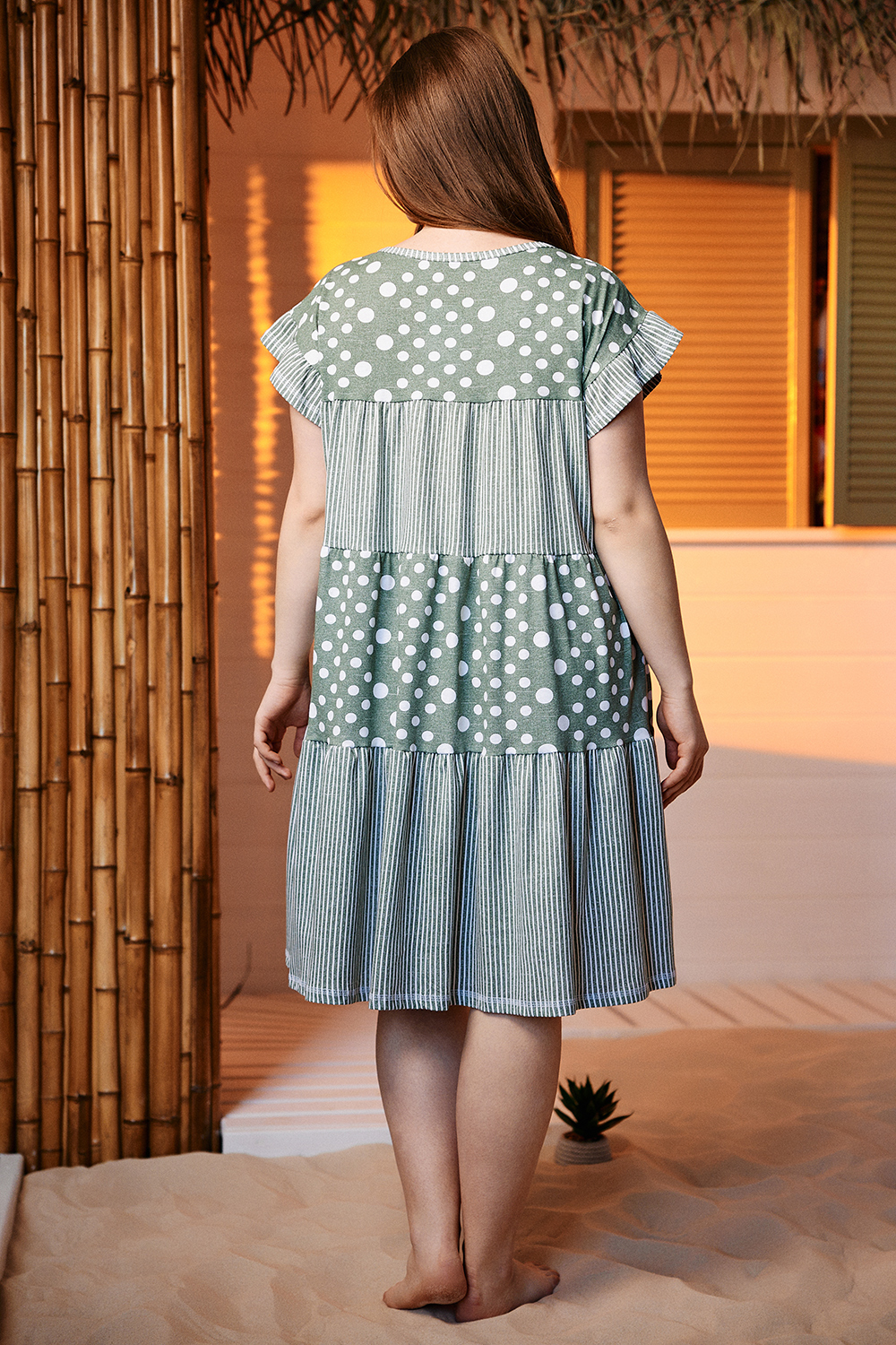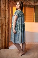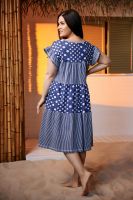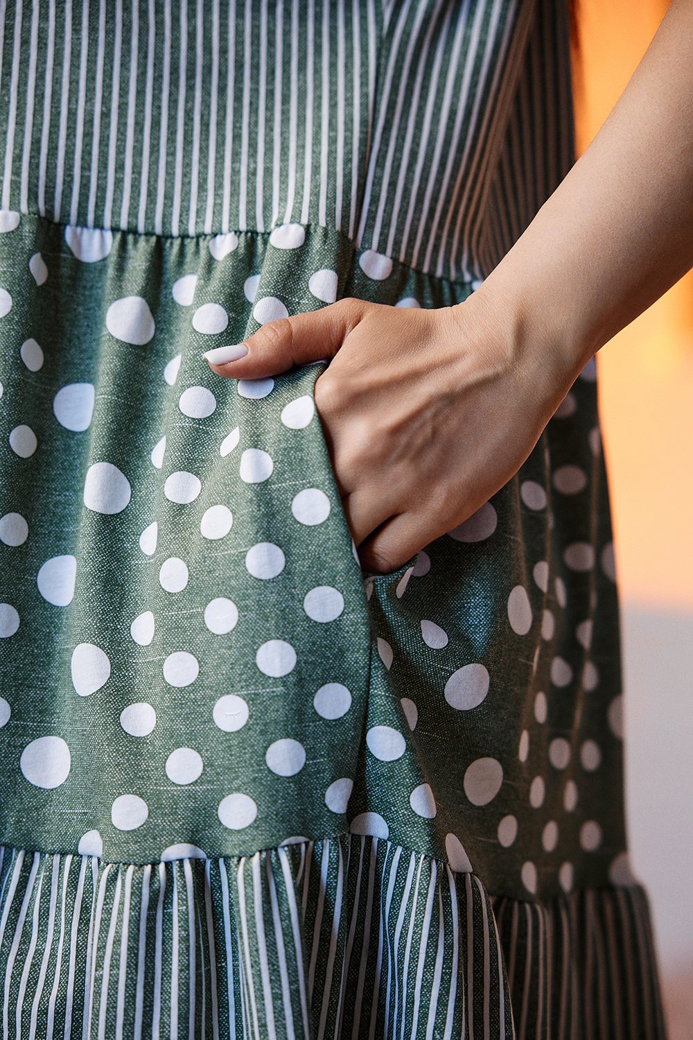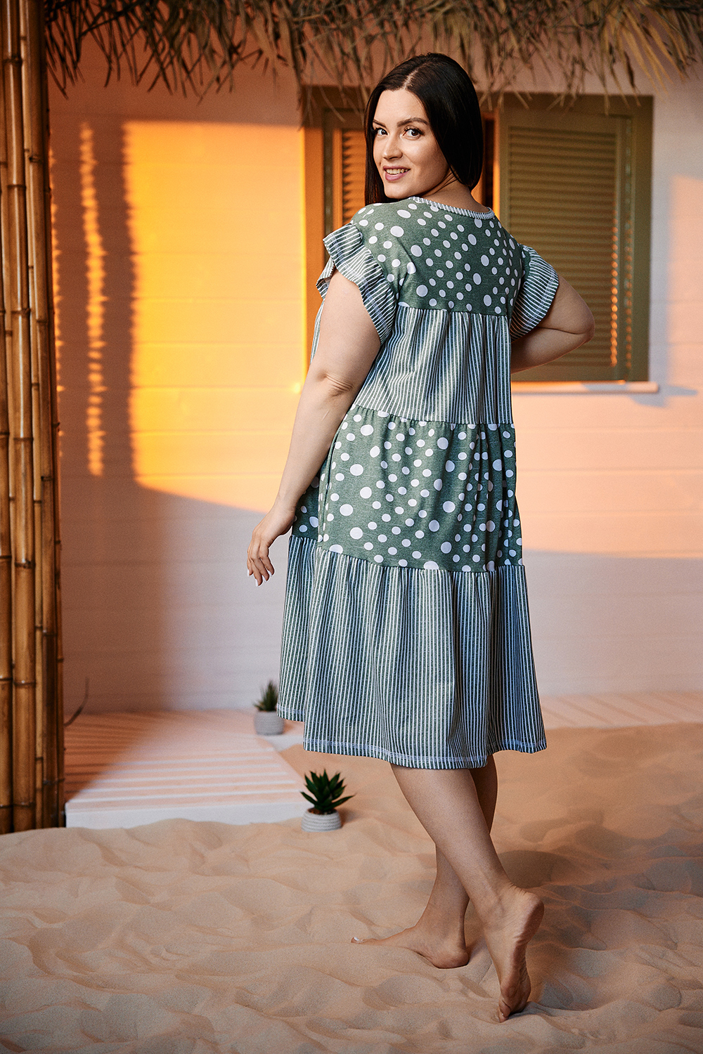 Платье женское, свободное, к низу расширенное за счет сборки каждого из трех ярусов. Рукав цельнокроеный короткий, внизу рукава рюша. Вырез горловины округлый. Эта модель платья очень комфортна для любого типа женской фигуры, а сочетание ткани в горошек и полоску придает изделию особую привлекательность.