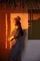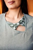 Платье женское полуприлегающего силуэта. Горловина асимметричная, рукав как таковой отсутствует за счет разрезов вдоль плеча, на полочке два накладных кармана. В боковых швах разрезы. Бантики в горловине и разрезах рукавов придают платью особую женственность.