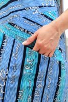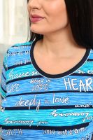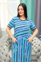 Платье женское полуприлегающего силуэта. Горловина округлая, Рукав втачной короткий. Полочка и спинка состоят из трех частей с разнонаправленной полосой. На полочке внутренние карманы.