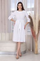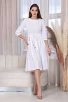 Платье с застежкой на потайную молнию в среднем шве спинки, без воротника, в круглым вырезом горловины. Платье отрезное по линии талии. Нижняя часть платья оформлена складками по шву притачивания к лифу. В боковых швах расположены карманы. Универсальность в сочетании с невесомостью и текстурой материала делают эту модель востребованной в любых случаях.