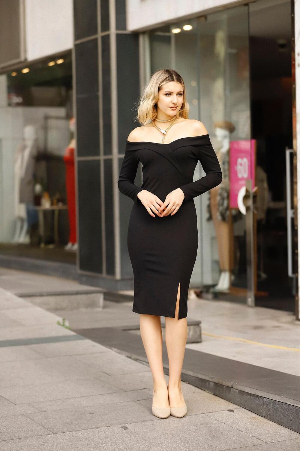 Облегающее платье с открытыми плечами, с разрезом спереди длиной миди сделает вас неотразимой и привлекательной.