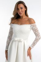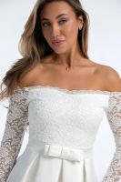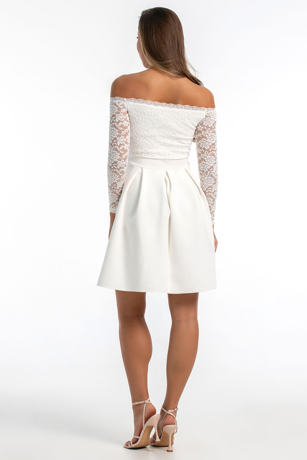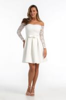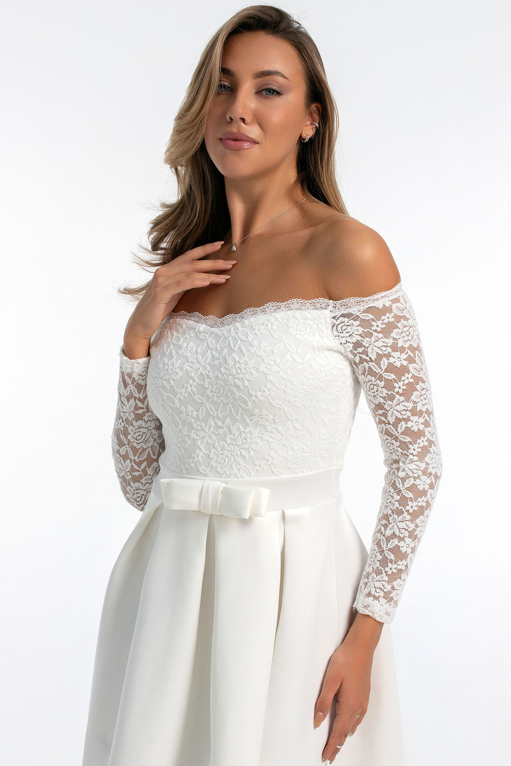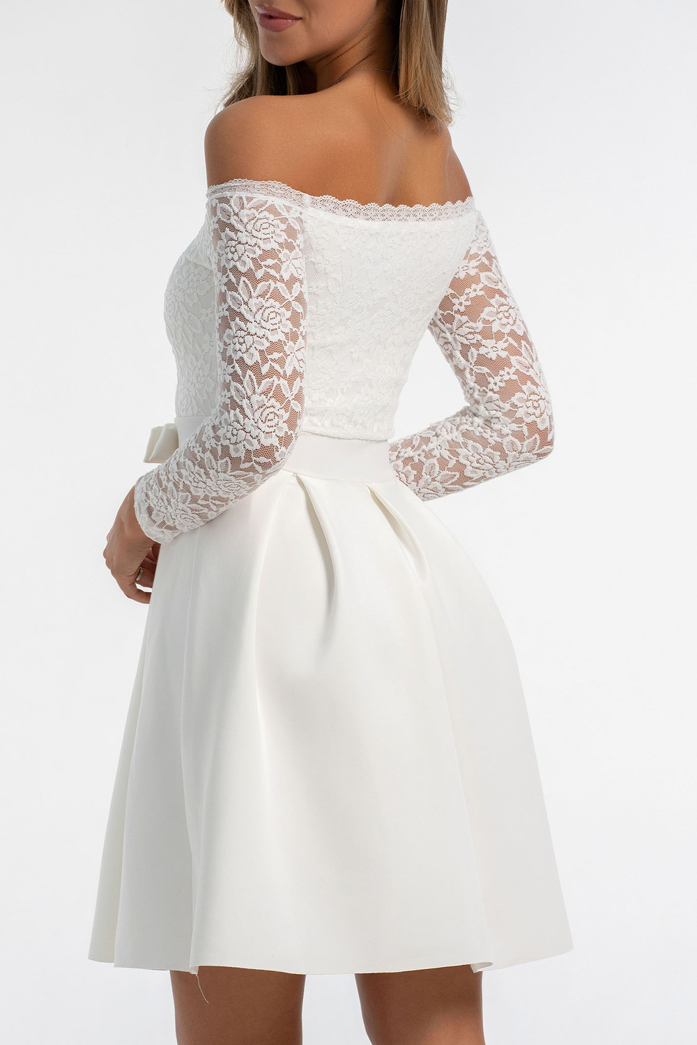 Утонченное приталенное платье длины мини с открытыми плечами с рукавами и нежным прилегающим лифом из кружевной ткани, а также струящейся юбкой со складками и декоративным бантиком на талии, выполненное из приятной к телу однотонной ткани.